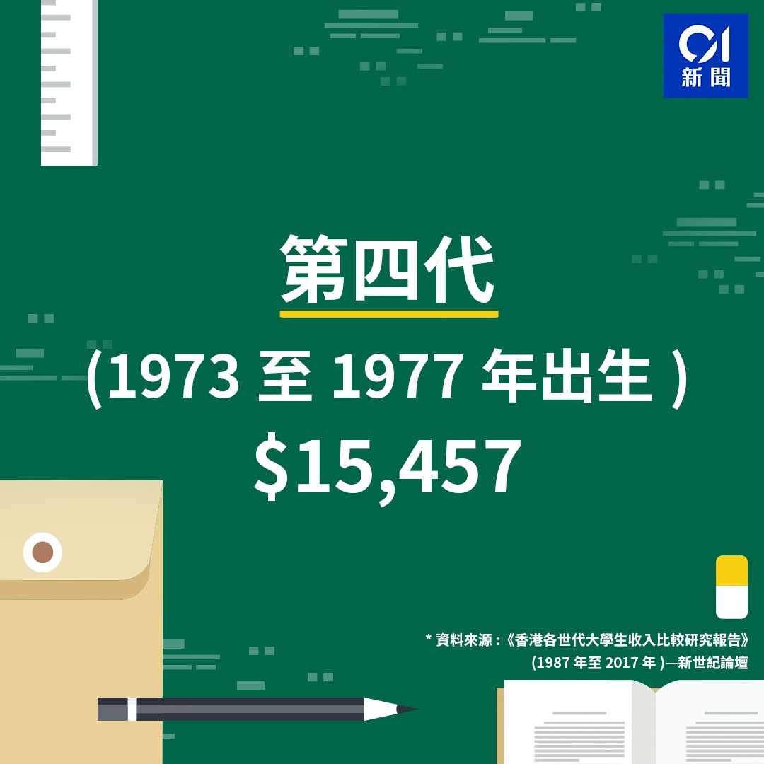 第三代大學生初入職收入中位數為15,929元,是調查中中位數最高的一代。(香港01製圖)5 [" E% e& E; M9 }& n+ t