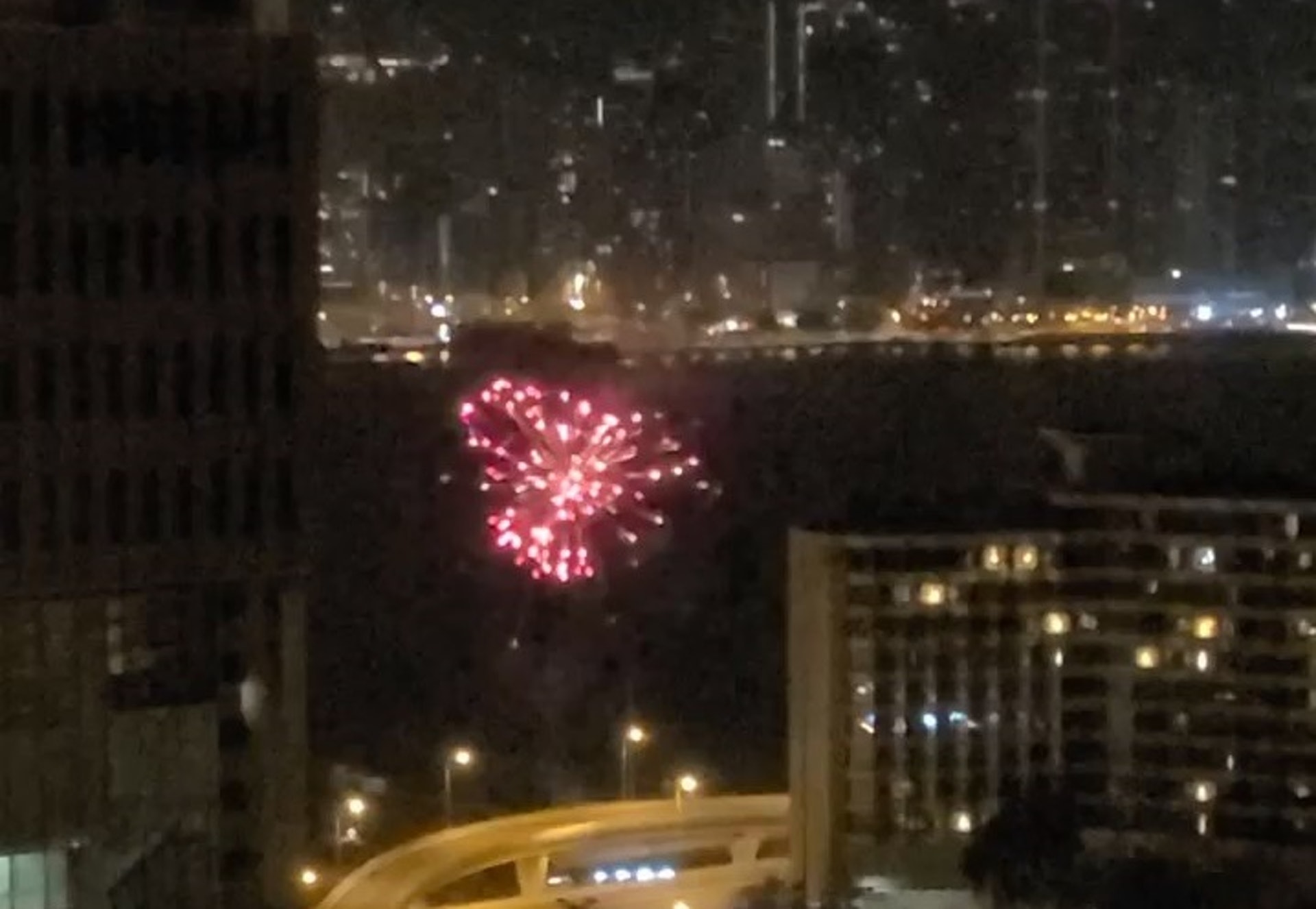 W: ?/ T, ?$ q: L! v五光十色的煙花,在紅鸞道近海傍一帶上空綻放。(fb「香港突發事故報料區」影片截圖)