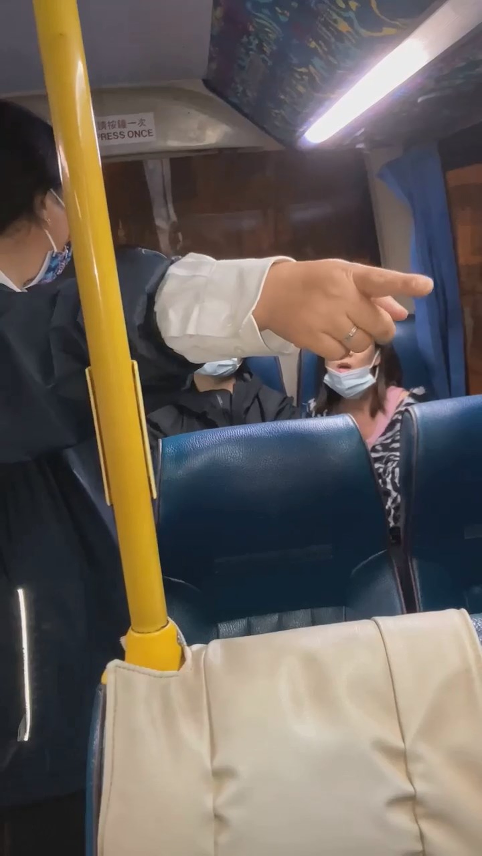其後司機表示報警處理,片中亦傳來男乘客疑似報警的對話,表示「昂坪巴士站,有兩個乘客唔戴好口罩,跟住司機叫佢落車佢又唔肯落,叫佢戴番好個口罩又唔戴!」其他乘客續向該名女子「圍剿」,她怒稱:「個口罩太大呀,關我咩事呀!遲啲係咪要整容去戴口罩呀我?」期間男方突然舉起中指,女方則指「睇法例啦」,車長及乘客隨即一人一句說出有關法例。直至片末,可見1名相信是女職員以強硬態度要求2人落車。