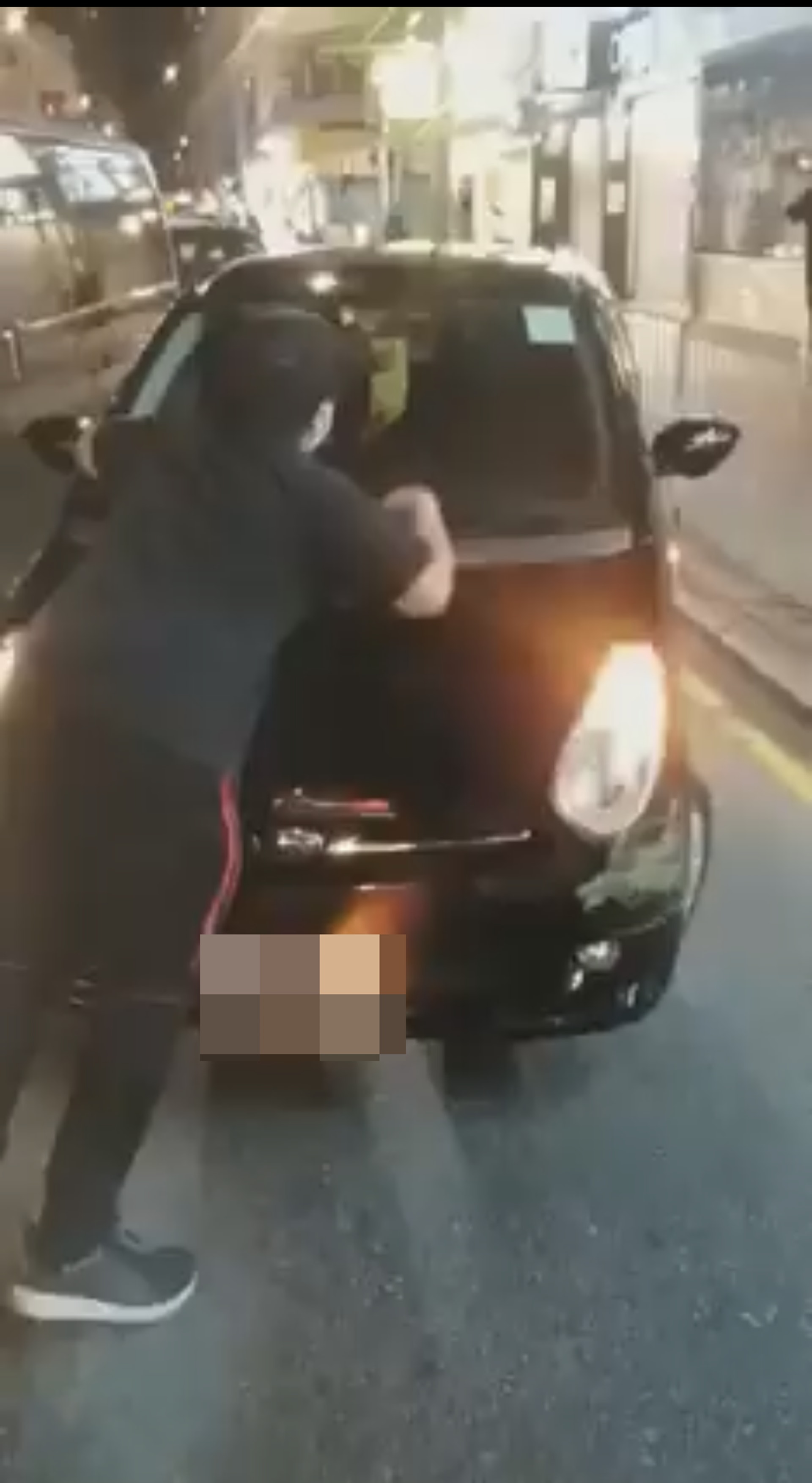 一輪唇槍舌劍後,女司機竟踩油險些撞倒男司機,男司機遂伏在黑色私家車上圖阻止離開,豈料女司機竟再度踩油,連伏在車頭的男司機一路推行至約百多米外的馬路上,Kenny一路狂奔盡力跟拍,身旁目擊市民無不驚呼「痴線架!」,惟力追下仍只拍得男司機跌坐地上,女司機則絶塵而去。