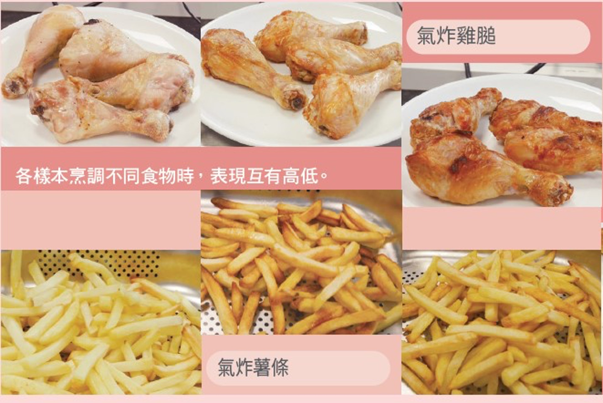 評審樣本氣炸4隻雞膇表現,經各樣本氣炸後雞膇的中心溫度均超過85℃或以上,其中5款「Recolte」、「普樂氏Proluxury」、「Denki」、「伊瑪牌Imarflex」及「億世家ecHome」表現較出色,能均勻地烹調,氣炸後的雞膇多肉汁而雞皮又香脆,獲5點的最高評分。