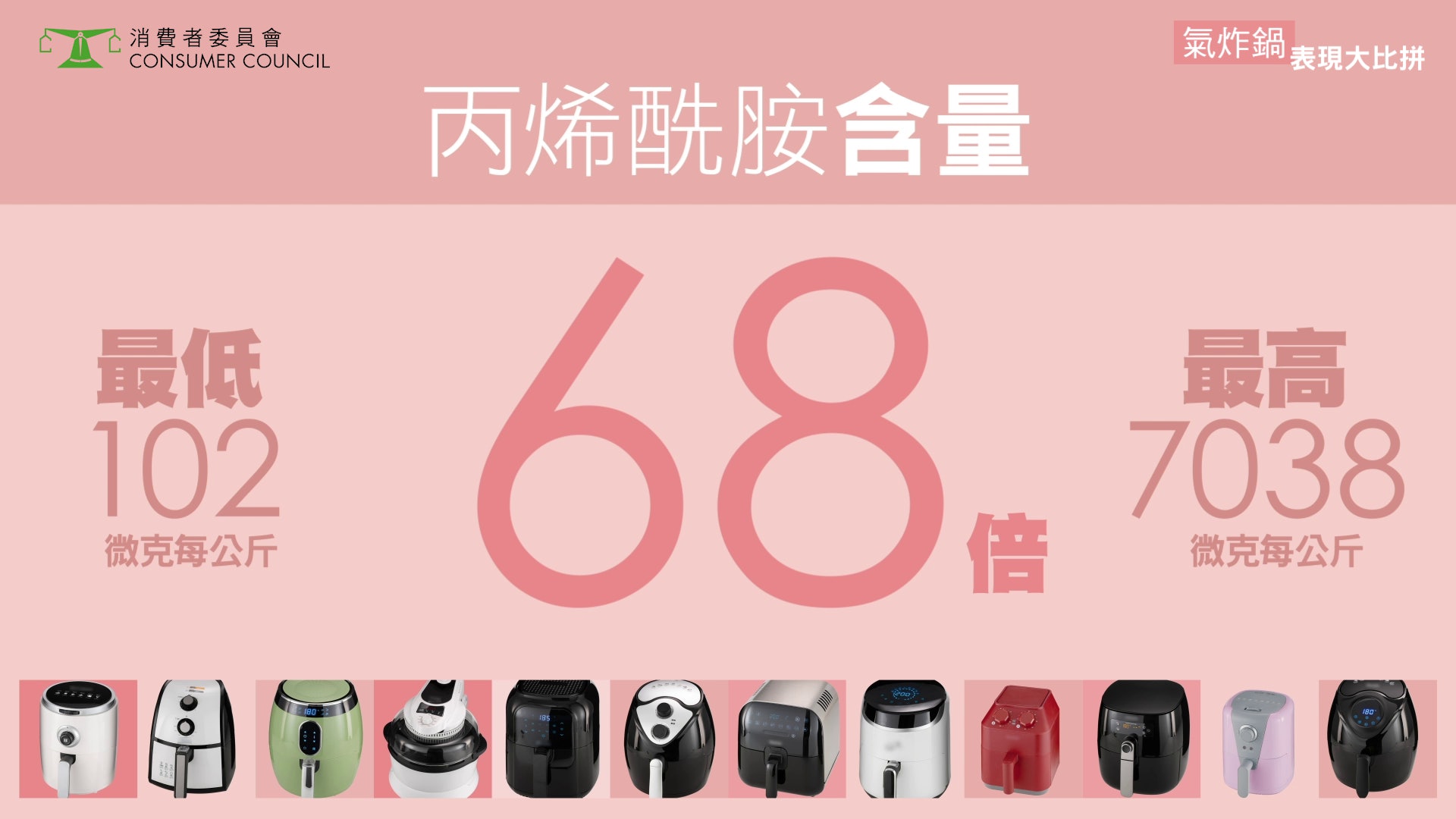 消委會測試薯條中的丙烯酰胺含量,發現薯條經各樣本氣炸後的丙烯酰胺含量由每公斤102至7038微克, 最高與最低相差68倍。6款樣本包括「普樂氏Proluxury」、「Denki」、「Midea」、「伊瑪牌Imarflex」、「億世家ecHome」及「TSK」的氣炸薯條的丙烯酰胺含量高於基準水平(500微克/公斤)。