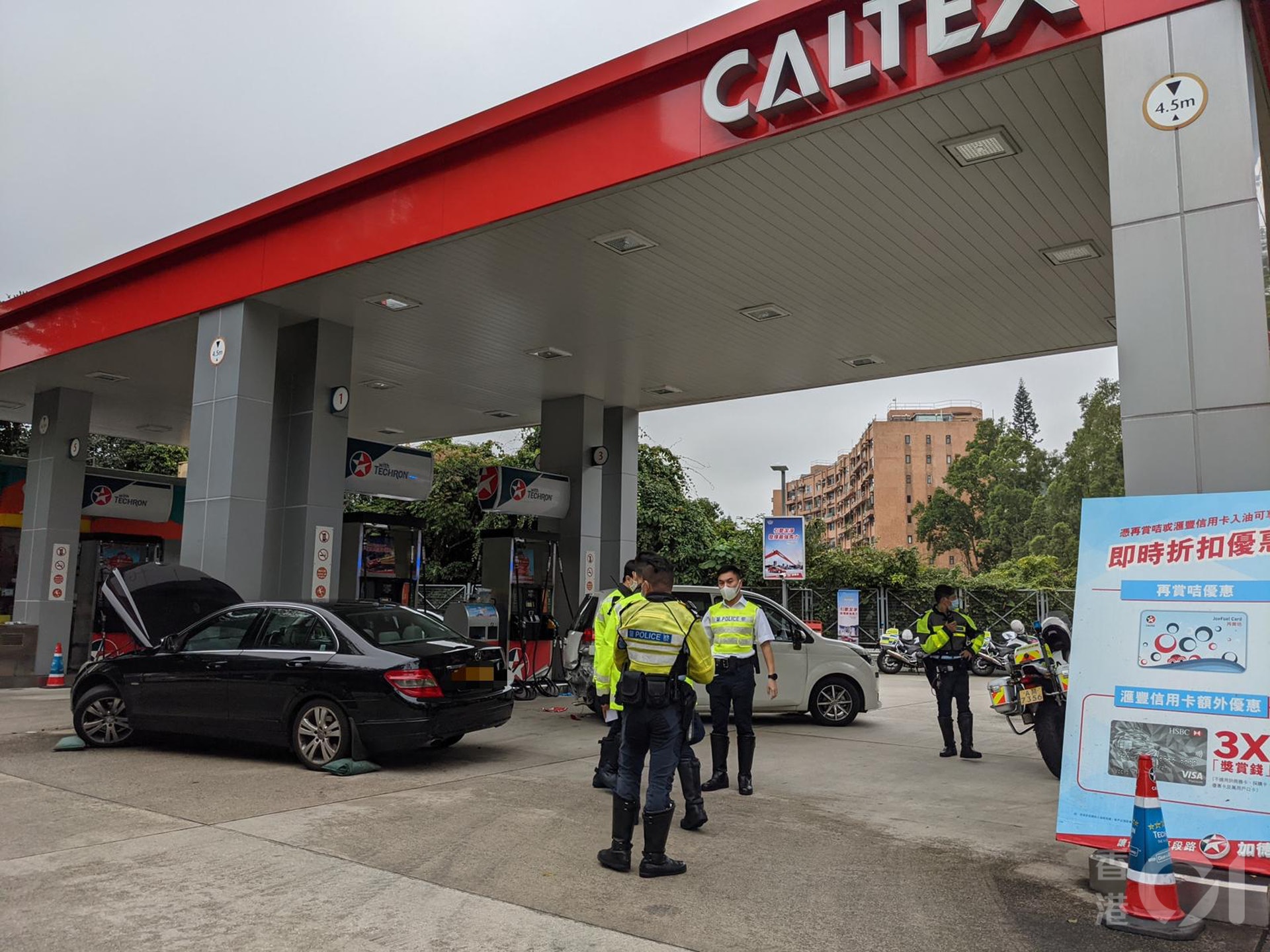 涉事Benz的車頭損毀,豐田車尾被撞至凹陷,泵把甩脫。而油站的支柱亦被撞至變形。警方在現場調查, 28歲姓俞Benz男司機通過酒精呼氣測試,他涉嫌危險駕駛引致他人身體受嚴重傷害被捕,現正被扣留調查。姓李54歲豐田男司機幸無大礙,在現場協助警方調查。