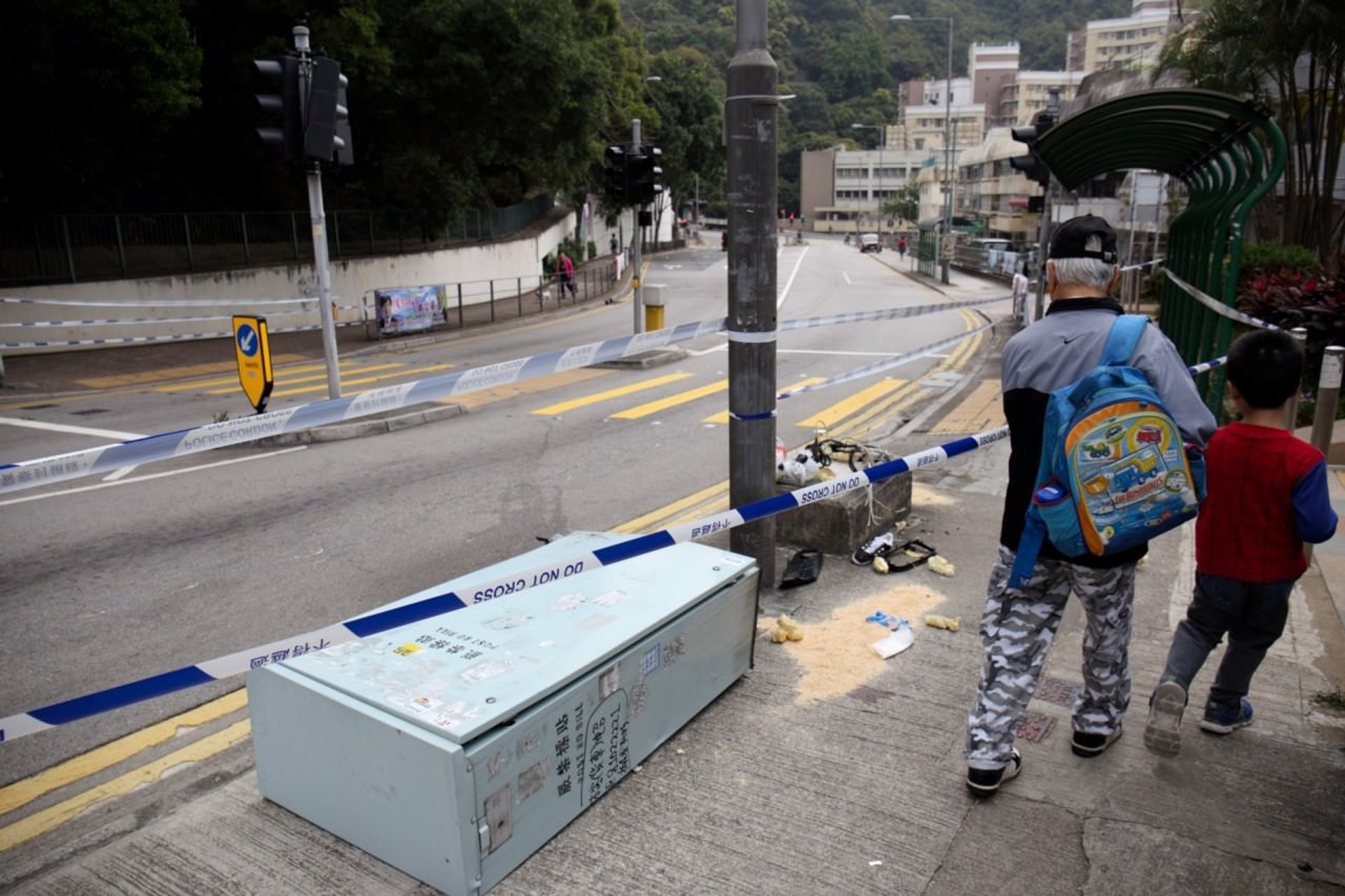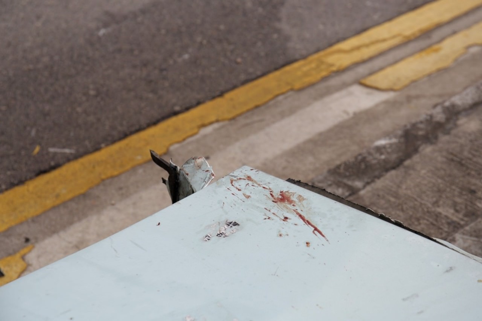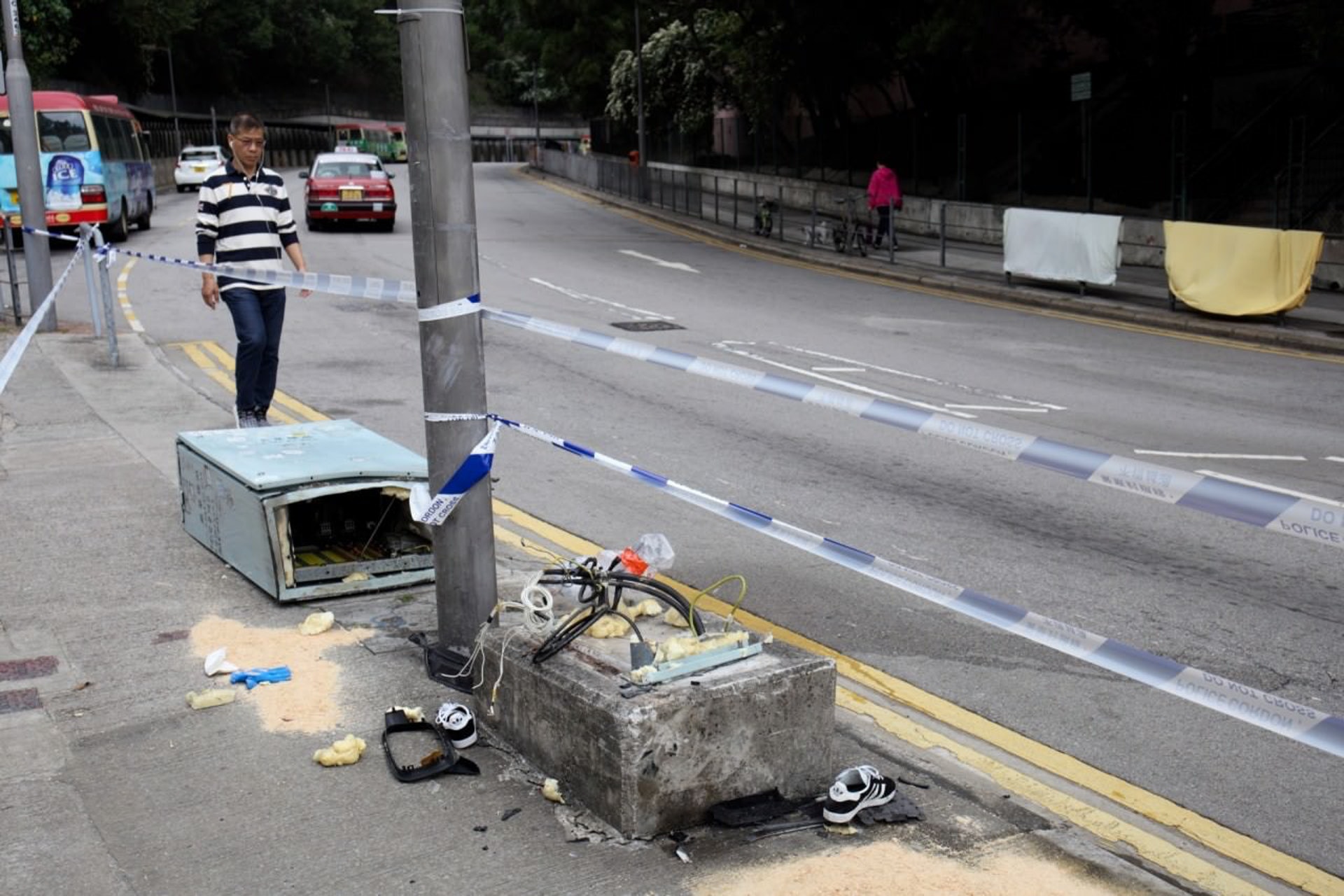 ) f* V. c4 W, |/ n3 Q被告陳曉昇駕黑寶馬剷上行人路,交通控制箱上留有女事主血跡。(資料圖片)