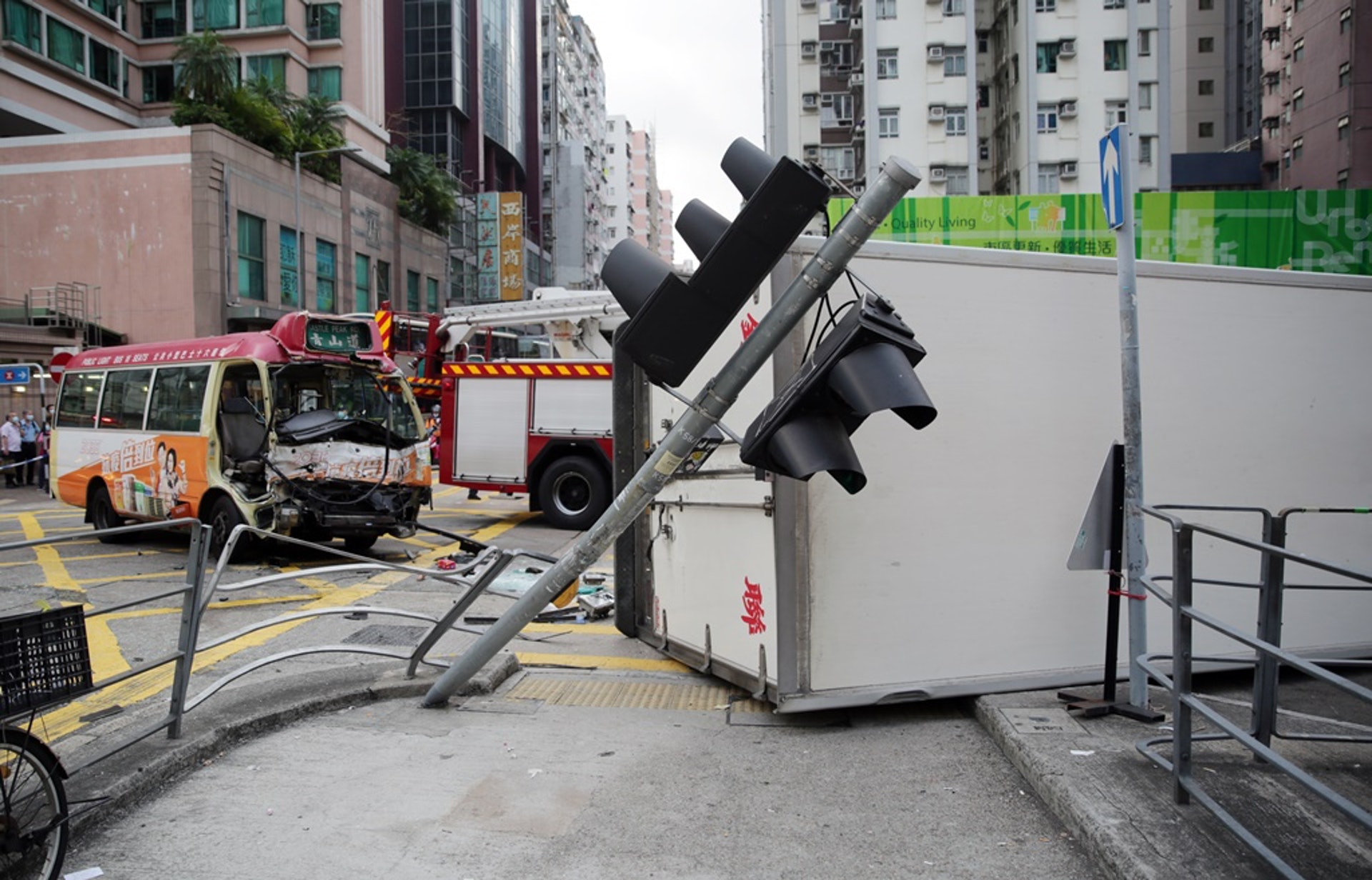 , N9 I+ e Y) p# X+ z6 X+ I9 O& g% [tvb now,tvbnow,bttvb長沙灣發生車禍,多人受傷。現場為東京街與元州街交界,凌晨6時半左右,據報一輛公共小巴沿元州街往荔枝角方向行駛,途至上址十字路口時,與一輛由東京街往海皮方向行駛的密斗貨車相撞,貨車意外後翻側,壓在路中心安全島位置,及壓毀交通燈柱;而小巴則車頭嚴重凹陷,司機被困。