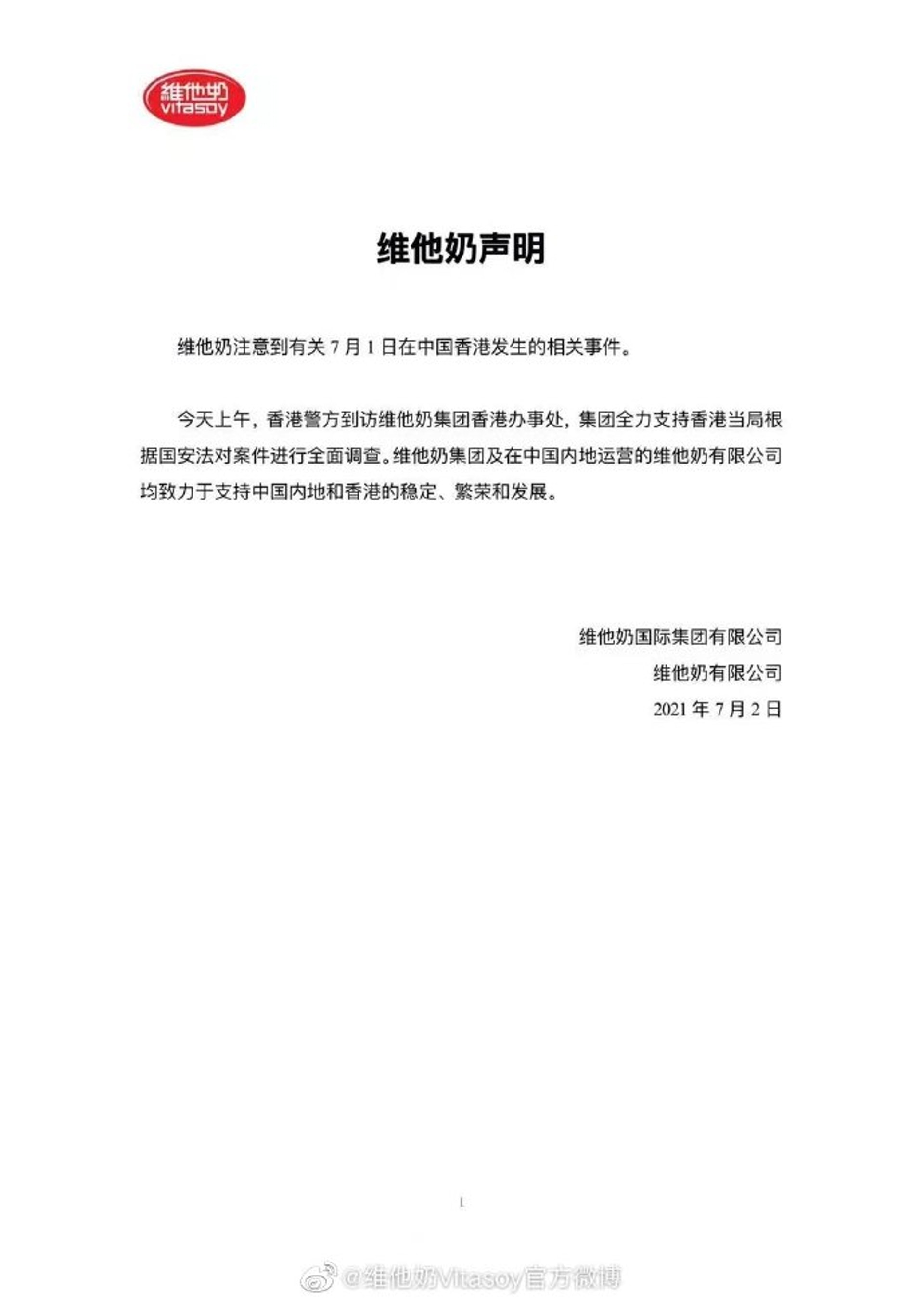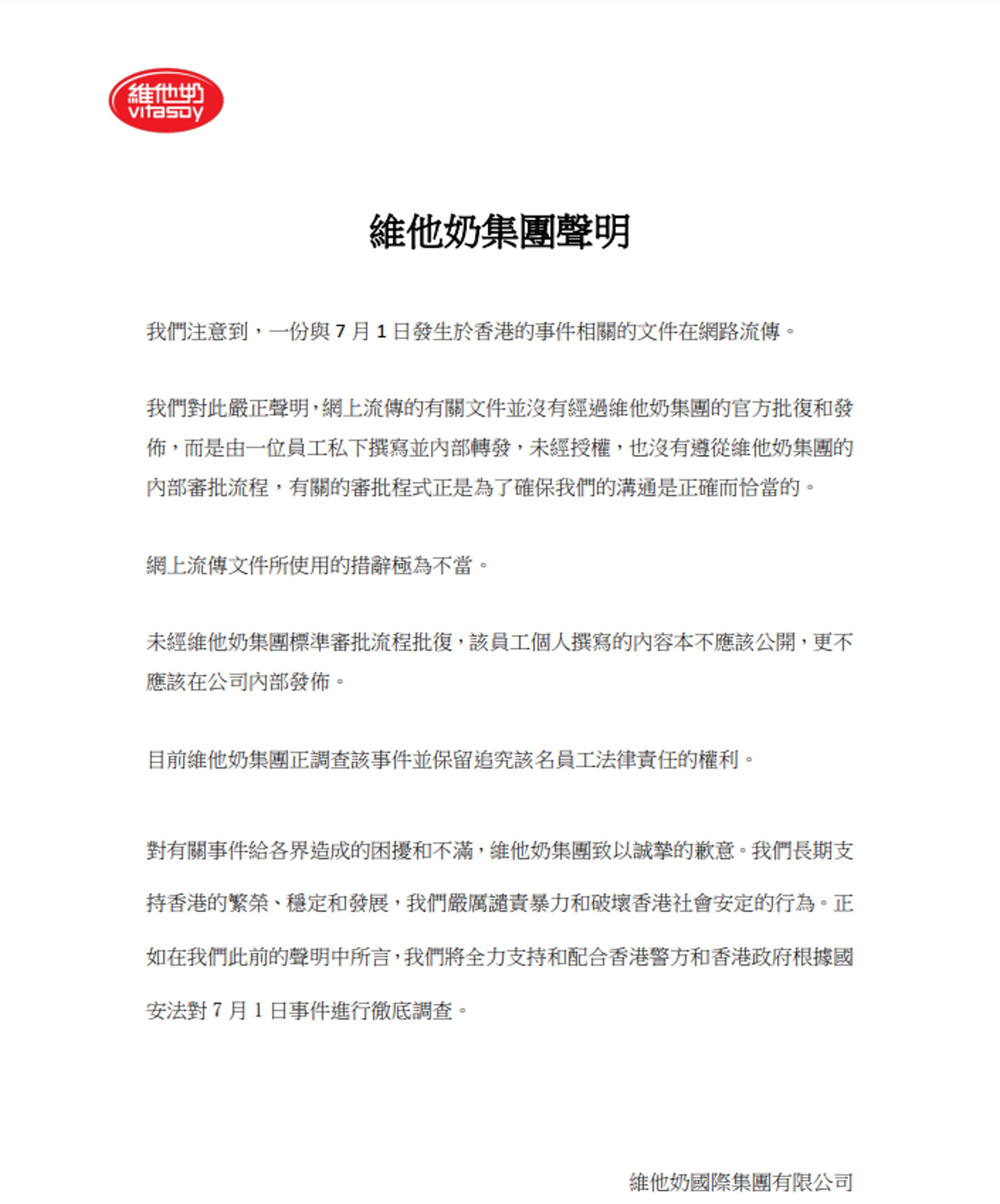 ' M* |3 \( y0 E- x. Z" n維他奶今(3日)兩度發聲明,稱通告「措辭極為不當」,指涉事員工個人撰寫的內容不應在公司內部發佈,重申嚴厲譴責暴力和破壞香港社會安定的行為。不過有關聲明惹來「甩鍋」批評,似乎未能平息內地網民怒火。