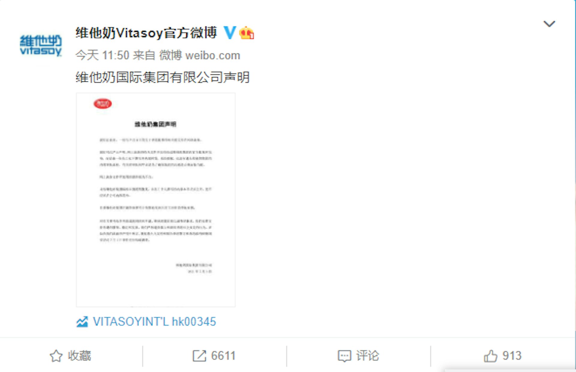 內地網民要求維他奶「滾出大陸」,並揚言即日起全面抵制維他奶產品。(維他奶微博截圖)