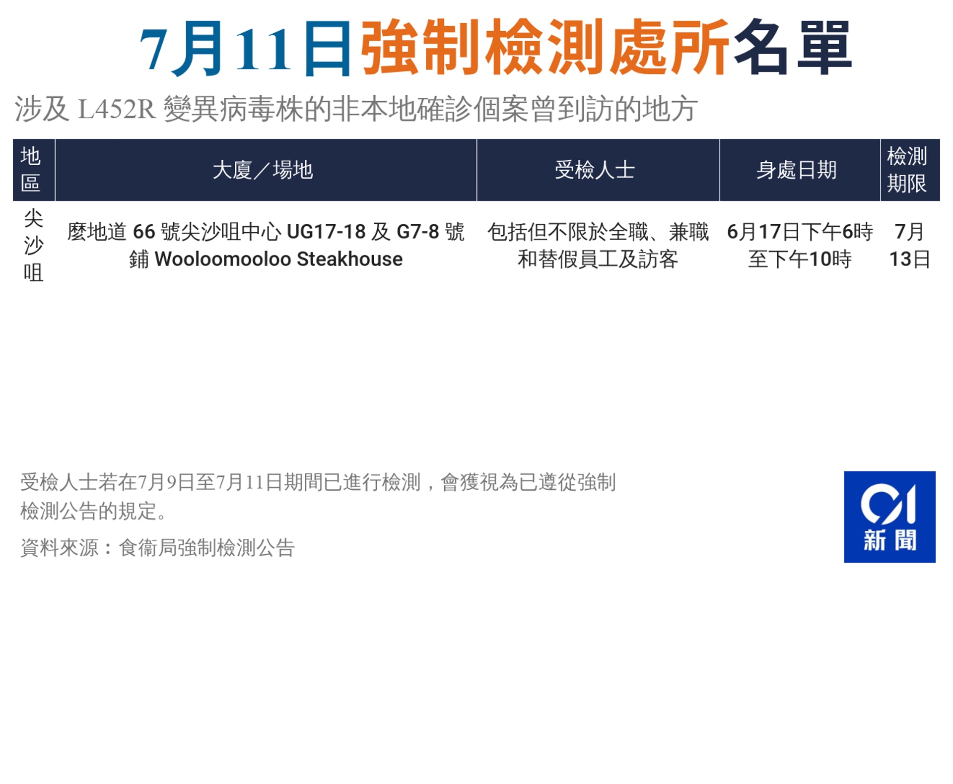 另外,在衞生防護中心的進一步調查下,早前一宗曾於香港居住、涉及L452R變異病毒株的非本地確診個案,曾身處一個指明地方,該處同樣列入強制檢測通告。6月17日下午6時至10時曾到尖沙咀中心「Wooloomooloo Steakhouse」的人士,需於7月13日前,完成檢測。公仔箱論壇# B, i7 R0 S- |2 F9 t, ?8 s1 M8 O* @% M