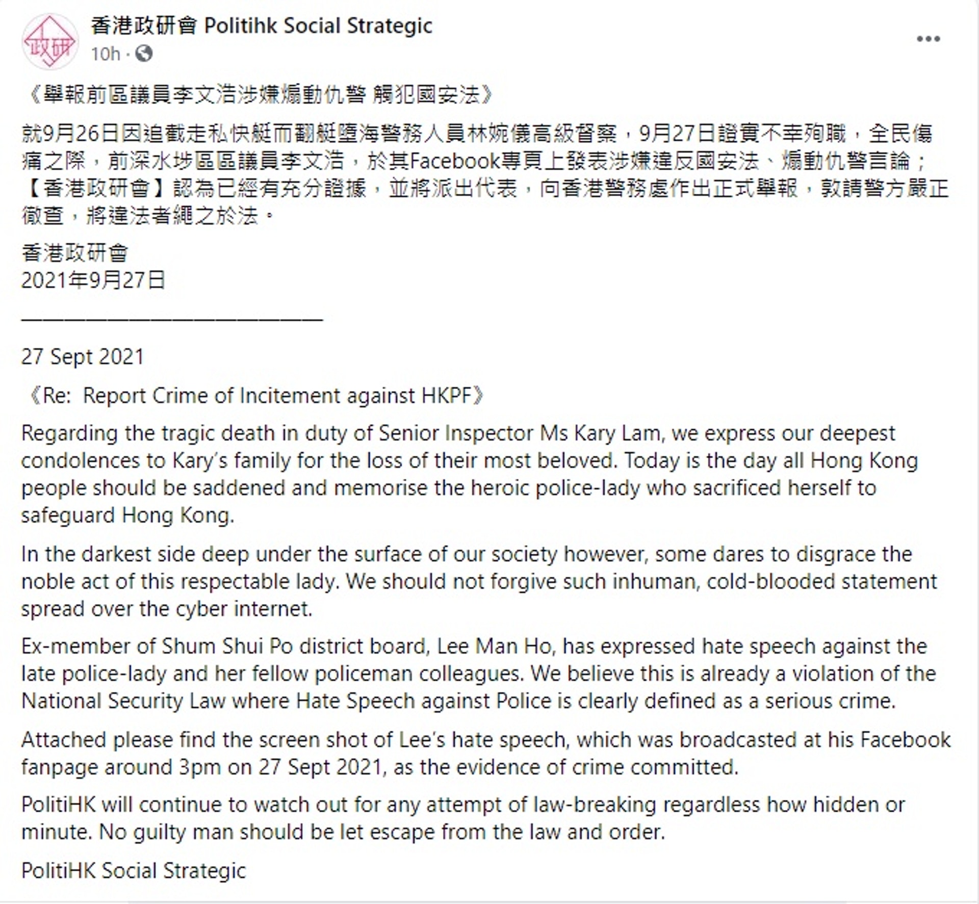 香港政研會昨晚於社交網發表中英文版本帖文,指李文浩涉嫌煽動仇警觸犯國安法:「全民傷痛之際,前深水埗區區議員李文浩,於其Facebook專頁上發表涉嫌違反國安法、煽動仇警言論。」該會認為已經有充分證據,並將派出代表向香港警務處作出正式舉報,敦請警方嚴正徹查,將違法者繩之於法。tvb now,tvbnow,bttvb- B* f9 J8 `; `! N3 o% y