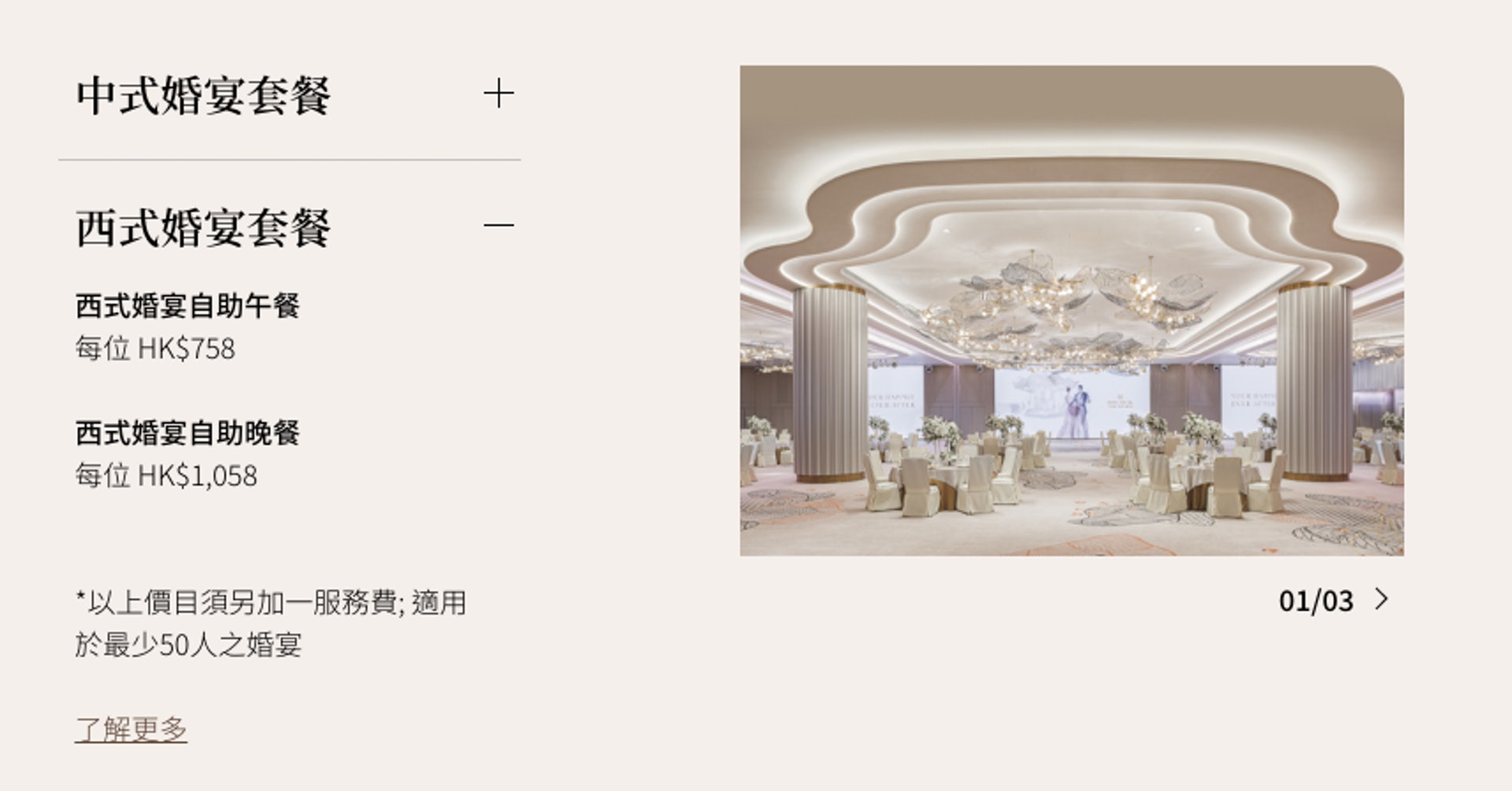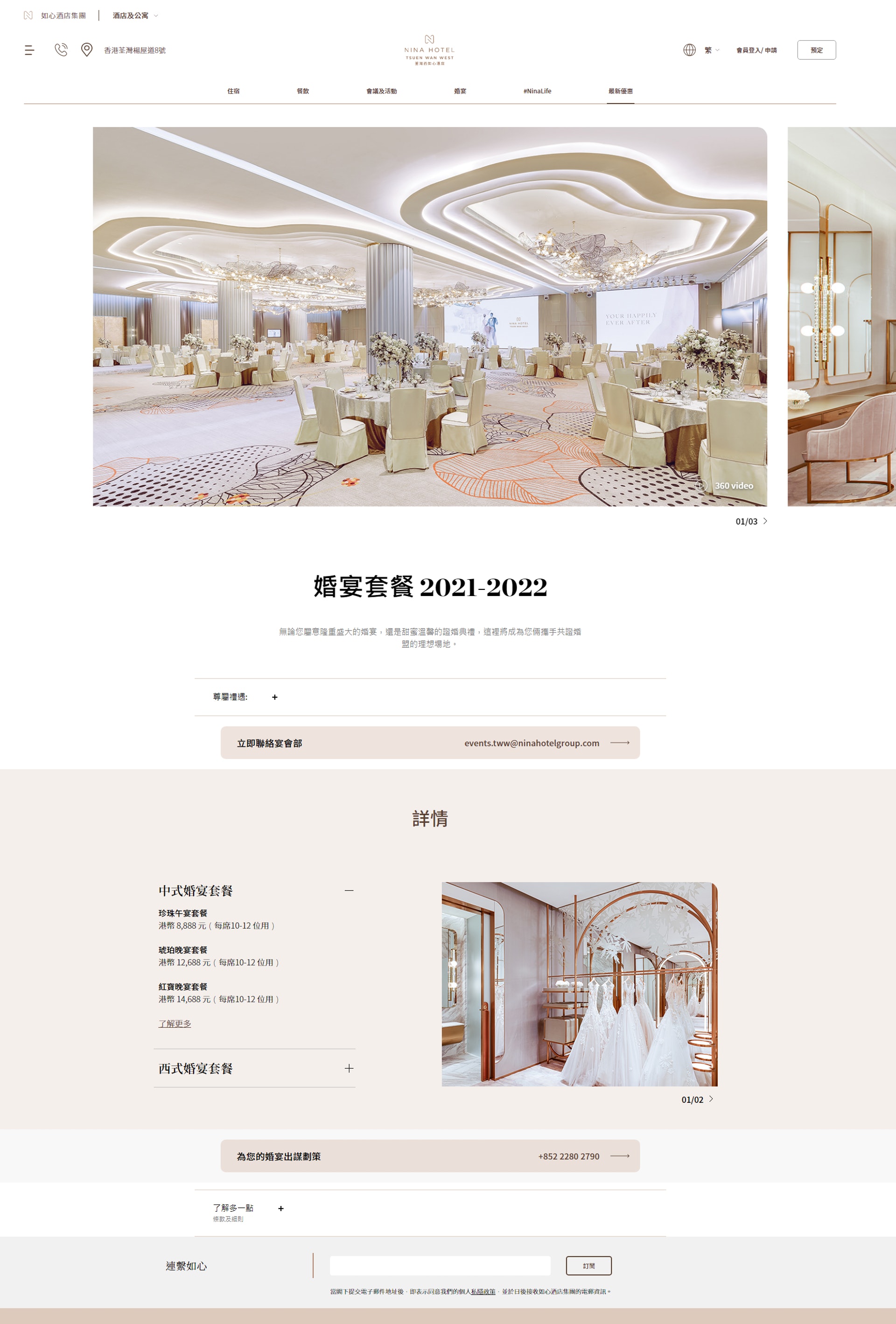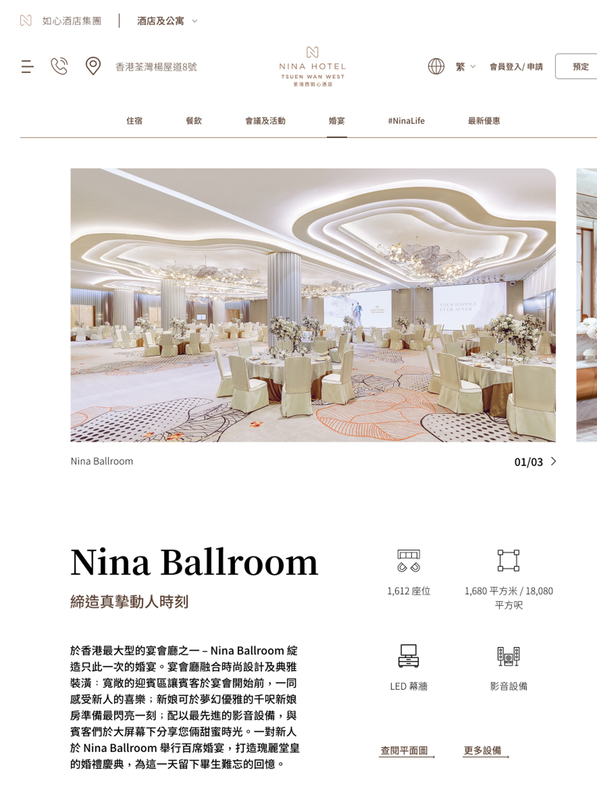 8 K4 Y$ |& {8 o& x- K# v公仔箱論壇荃灣西如心酒店的官方網站顯示,Nina Ballroom為「香港最大型的宴會廳之一」,可舉行百席婚宴,三個宴會廳共有1.8萬平方呎,有1,612個座位。宴會廳可設中式和西式婚宴,賓客可在席間大快朵頤。官網現時仍可瀏覽婚宴套餐的詳情,其facebook專頁7月初仍有廣告指,能預訂中式婚宴酒席,並能提供優惠。