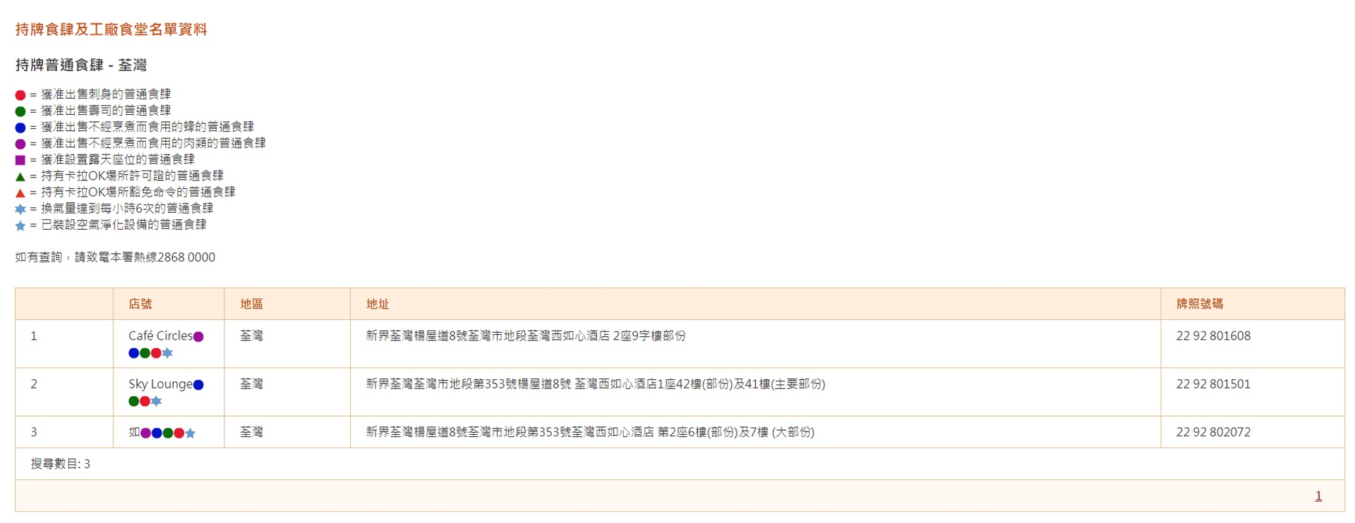 ' F& |% }3 `/ A: c2 G) ptvb now,tvbnow,bttvb荃灣西如心酒店內,只有3間餐廳取得食肆牌照,包括Café Circles、Sky Lounge和如,但不包括今次取消場地的「Nina Ballroom」。(食環署截圖)tvb now,tvbnow,bttvb( E2 b/ D) b- d1 U1 b. ~6 z