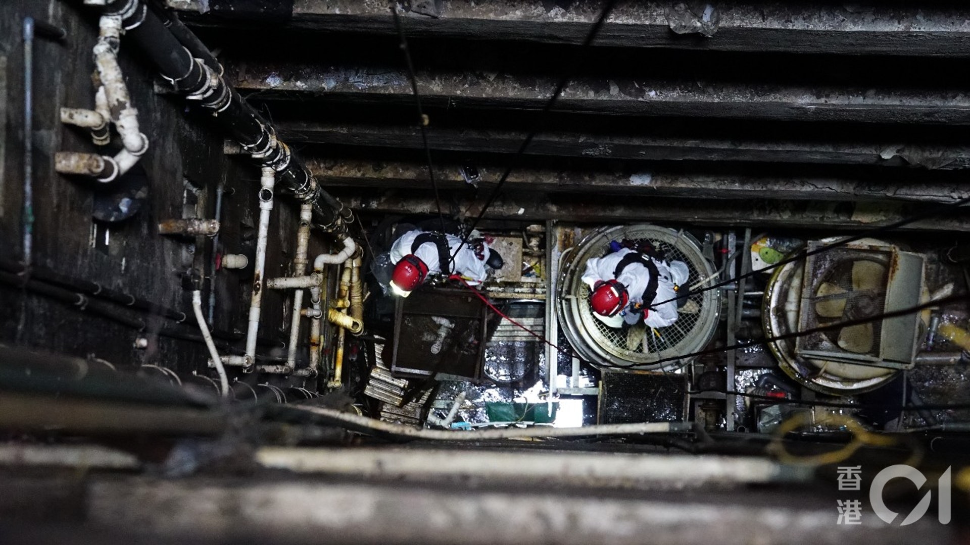 警方高空工作隊游繩搜證,由大廈天井游繩到天井底搜索,以查明兩名死者逃走、爬渠及墮樓經過。(馮國良攝)