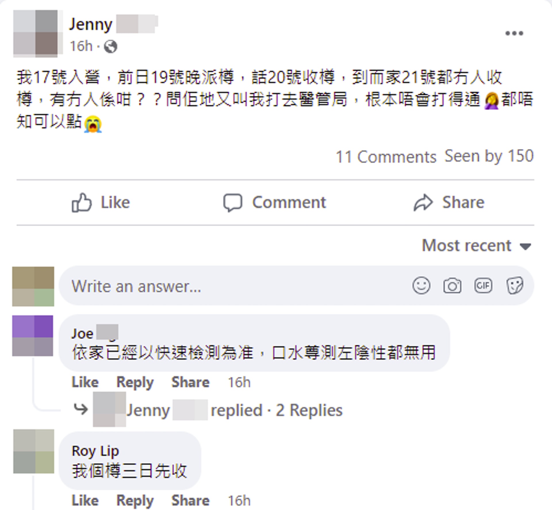 讀者鍾先生指自己於本月4日於醫院確診,並於12日獲醫生告知已無染疫,但因病床緊張,需轉送他至竹篙灣隔離營,他憶述醫生當時稱「再於營內留2至3日便可離去」。惟截至今天(22日),他已於竹篙灣留守超過10天,即使於營內已進行多次檢測,並得到無染疫結果,職員卻稱未有醫生批准為由,無法離去。當他再追問何時有醫生批准,職員卻不置可否。