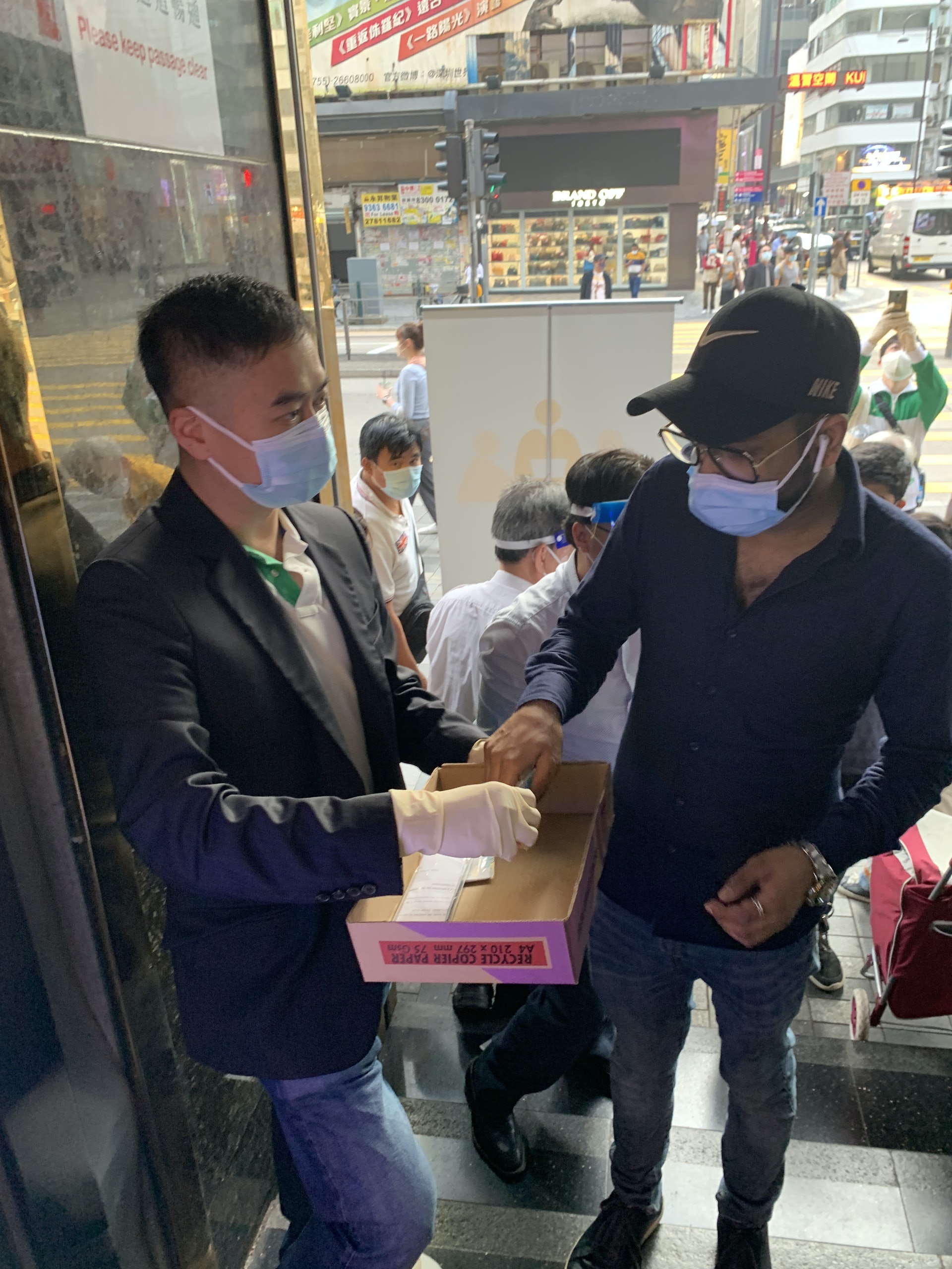 油尖旺民政事務專員余健強(右)向文昌街垃圾收集站的少數族裔清潔工人派發物資。(民政事務總署)