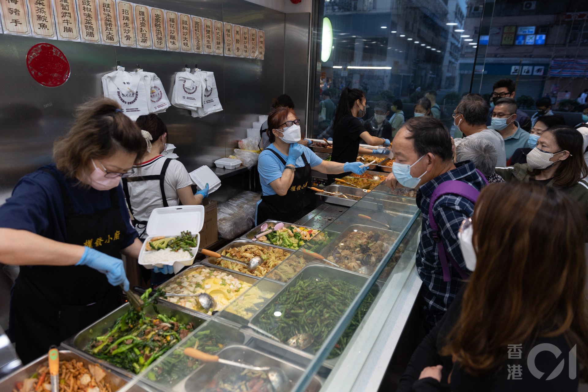 新冠肺炎第五波疫情嚴重打擊經濟,不少人停工或失業,兩餸飯專門店疫市大賣,3月16日晚其中一間門庭如市,迎來「賤物鬥窮人」時代。(廖雁雄攝)" M& I. X; M$ ` q/ r& M