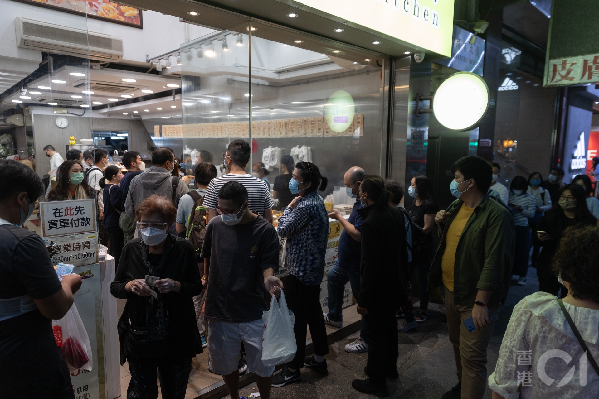 新冠肺炎第五波疫情嚴重打擊經濟,不少人停工或失業,兩餸飯專門店疫市大賣,3月16日晚其中一間門庭如市,迎來「賤物鬥窮人」時代。(廖雁雄攝)