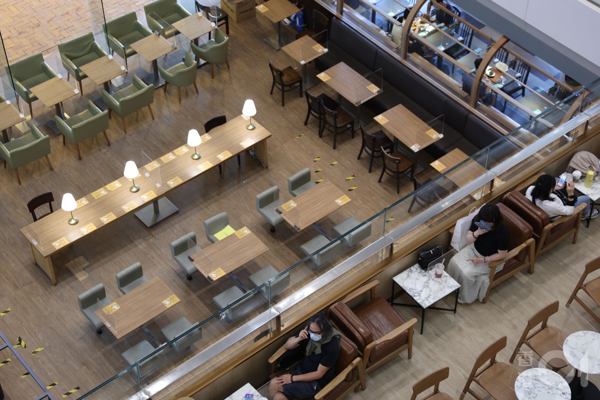- a( l7 L1 Q H) o" F; e! H1 p第五波疫情持續兩個半月仍嚴峻,食肆堂食限最多二人一枱,3月15日所見,午餐時段有食肆只有廖廖數名食客。(鄭子峰攝)