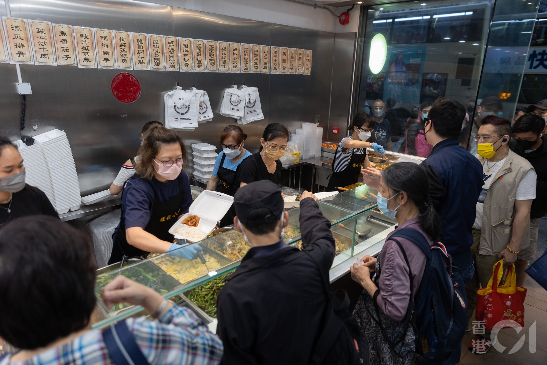 新冠肺炎第五波疫情嚴重打擊經濟,不少人停工或失業,兩餸飯專門店疫市大賣,3月16日晚其中一間門庭如市,迎來「賤物鬥窮人」時代。(廖雁雄攝)
