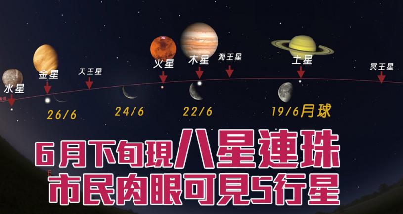 天文愛好者要留意,6月下旬將會有罕見天文現象「八星連珠」,八顆太陽系星體會在夜空連成一線,其中6月25日清晨更會是最佳觀賞時機。公仔箱論壇 n+ S0 U3 s% J3 E" V