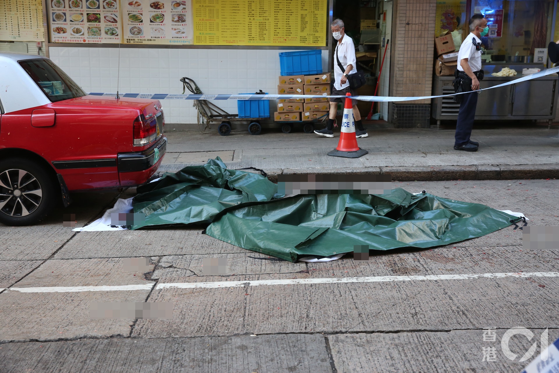 4 O; K/ b9 f# Q公仔箱論壇警方以帳篷遮上遺體。(王譯揚攝)