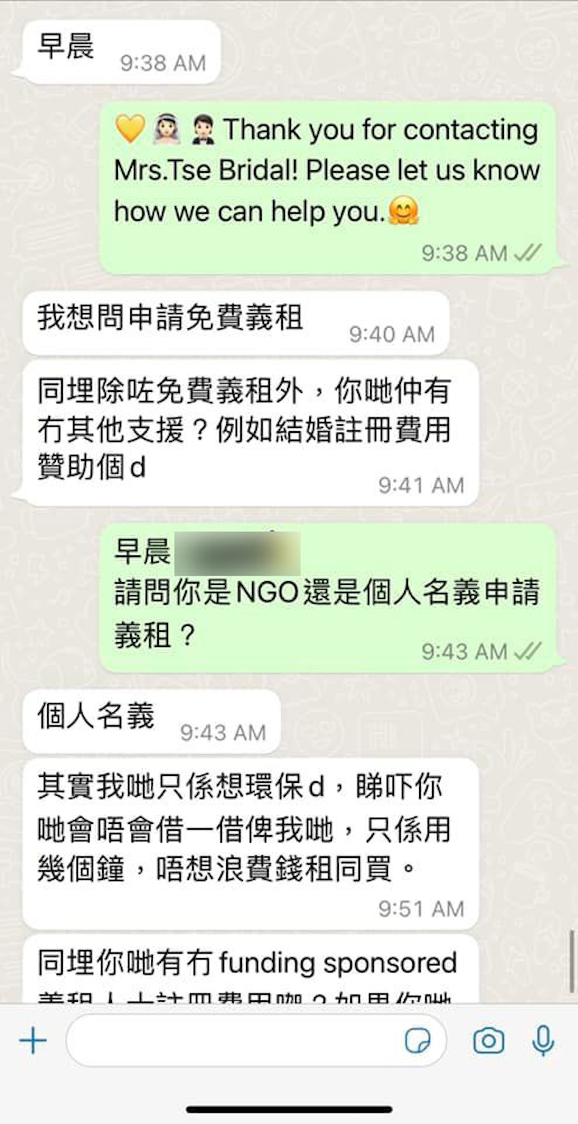 * g2 g7 p) O/ Y2 H- G& j' ]os.tvboxnow.comFacebook專頁「慧子婚紗 Mrs. Tse Bridal」今晨(9日)分享奇葩客人查詢,並上載2張對話截圖。對話中可見,有準新娘表示有意申請「免費義租」婚紗服務,詢問服務詳情,同時想了解店方會否提供其他支援如結婚註冊費用贊助。公仔箱論壇/ a& D: F: q3 G# }/ p