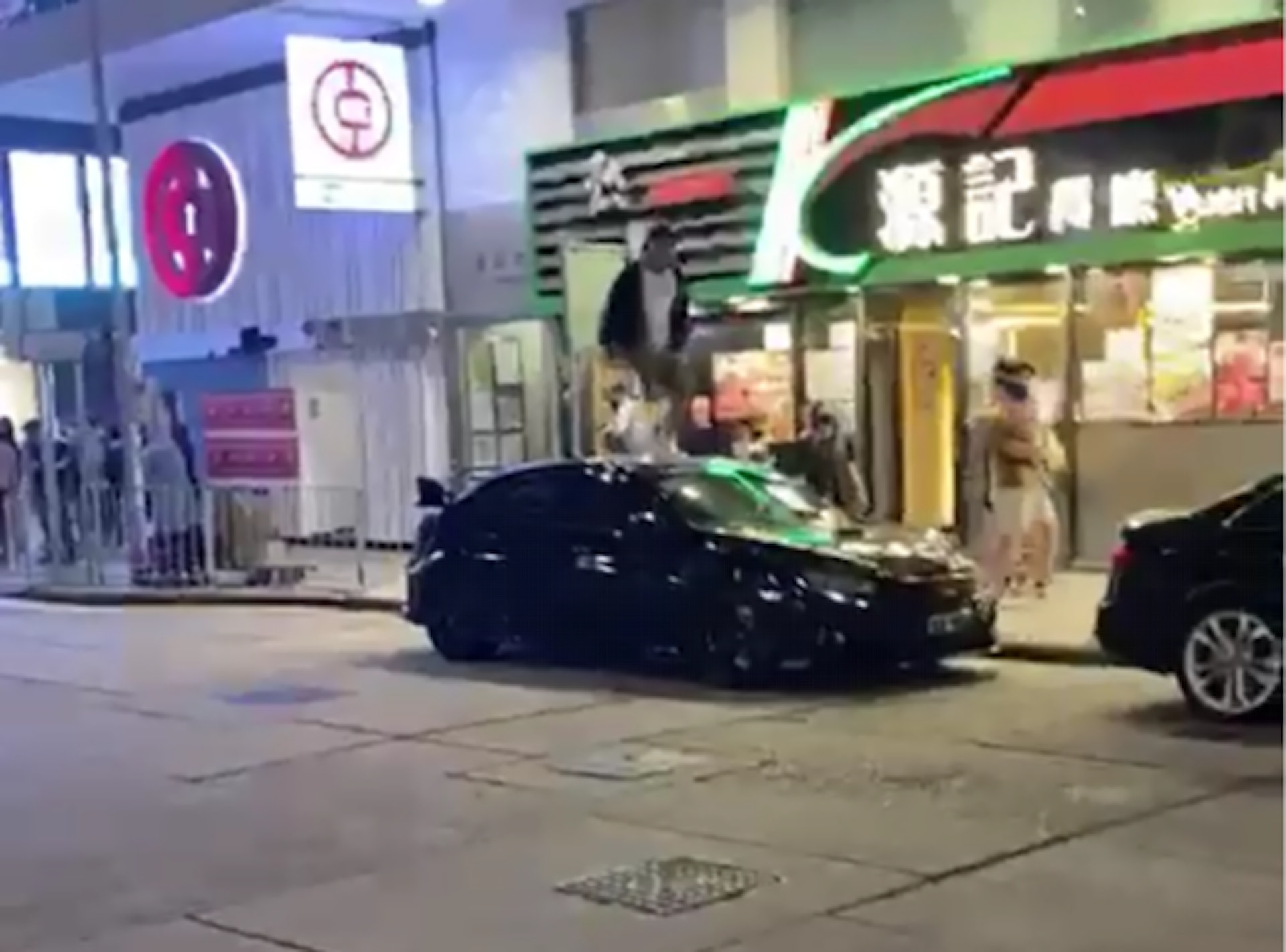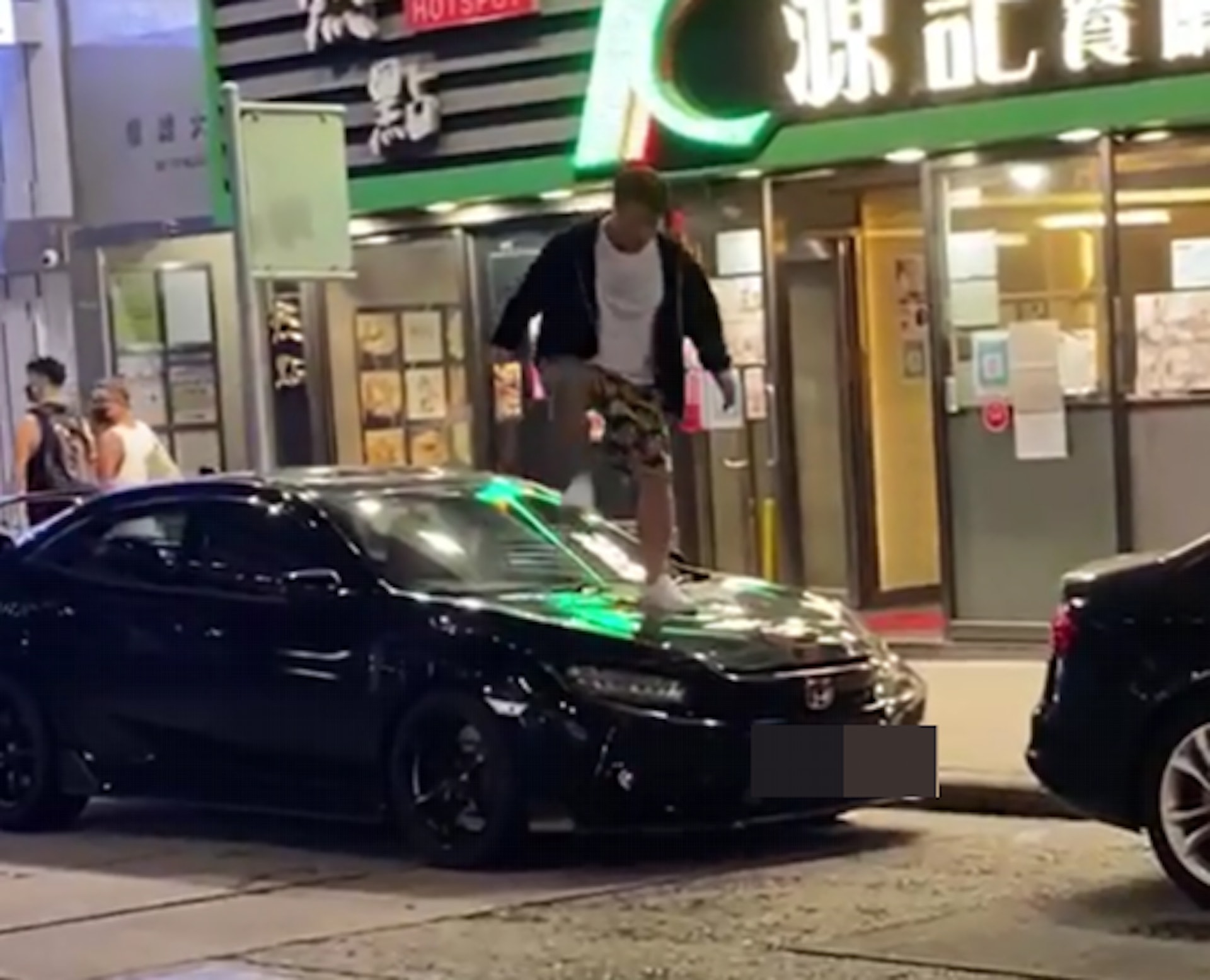 網上今日(23日)流傳多段影片,一輛黑色本田思域Type R FK8(Honda Civic Type R FK8)停泊於尖沙咀加連威老道16號一間餐廳對開,一名沒戴口罩的男子離奇跳上車頂,在上面來回走動,更瘋狂在車頂大力狂踩,一邊粗口橫飛,一邊用力大腳踩凹車頭冚,當場傳出多下「呯」的巨響,他大聲咆哮兼怒吼:「扮富貴!」
