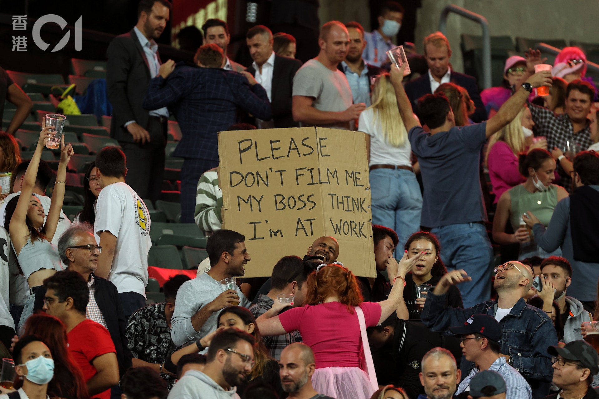 ; v0 B# }9 I, B" M6 b) m香港國際七人欖球場今日(4日)開鑼,有疑「蛇王」觀眾舉起紙牌着不要拍攝他,因老闆以為他在工作中。(張浩維攝)0 L# Y. ^0 N: F1 O- L1 g
