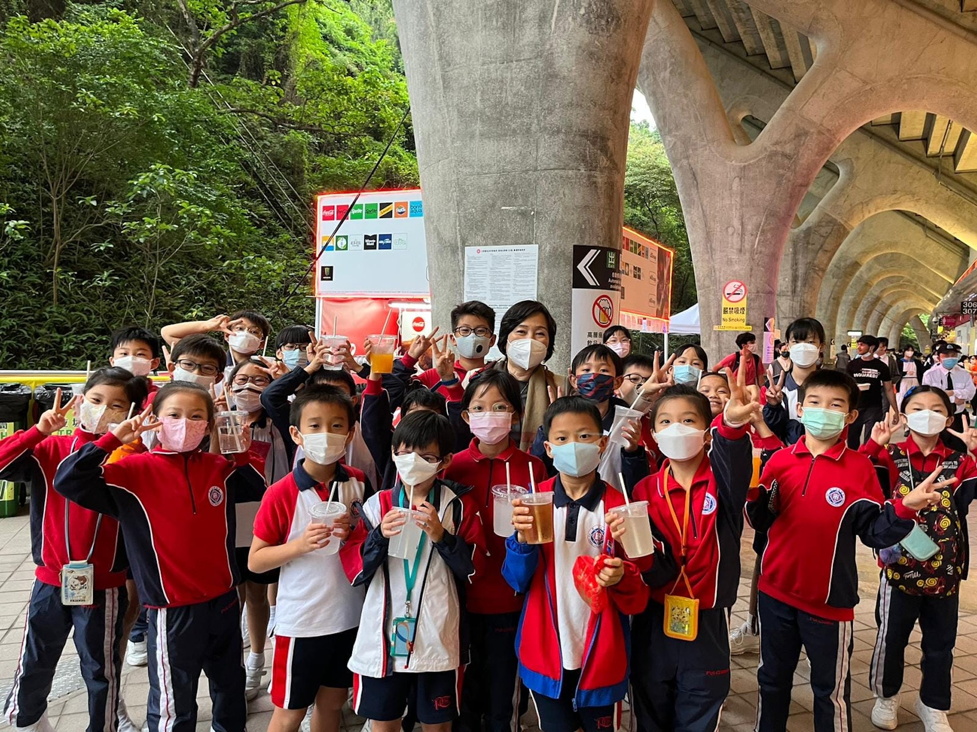教育局局長蔡若蓮(左中)11月4日與一班學生入場觀賞香港國際七人欖球賽,她指現場感受熱鬧氣氛,學習奮力拼搏的體育精神,實屬難得。(蔡若蓮Facebook圖片)
