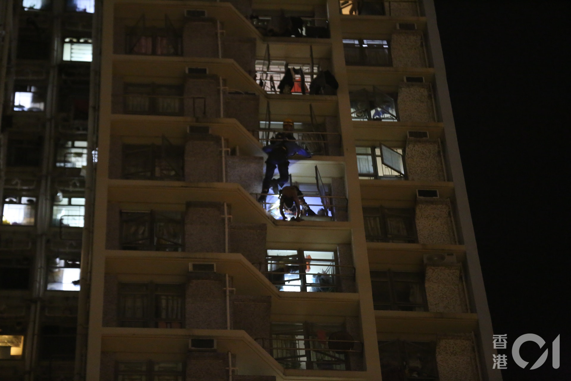 現場可見「飛將軍」救人的驚險一幕,當時男子危坐窗外簷篷,雙腳「吊吊揈」,更於窗戶窺探單位情況。後來他躺臥在晾衫架,與上層消防員對望,更懷疑曾飲通渠水自殘。兩名消防員其後進入涉事單位,見男子躺在晾衫架來回翻身,其後背部朝天,雙腳向住窗戶,消防員趁機一左一右捉住該男子腳部,嘗試將他拉回單位,同時「飛將軍」從上層游繩而下,協助將男子救回屋內。救援期間,男子不時掙扎及叫囂,一度「倒吊」,混亂間其衣物、鞋及通渠水亦飛脫,跌菅在大廈地下,場面險象環生,整個救援過程歷時約2分鐘。