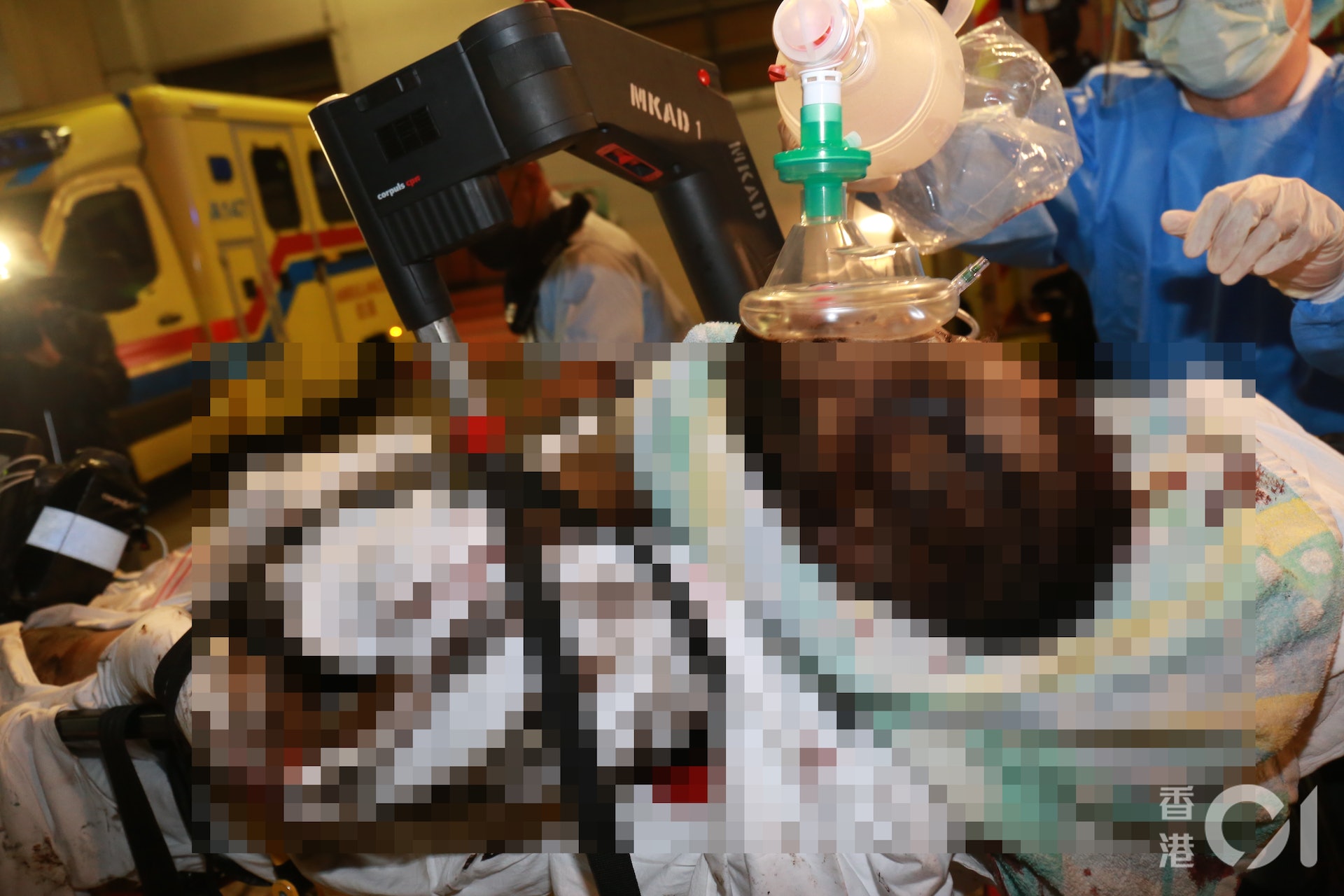 傷者送院時全身浴血,需用自動心外壓機急救。(林振華攝)7 w7 ?' l2 r! f1 {( ^% P