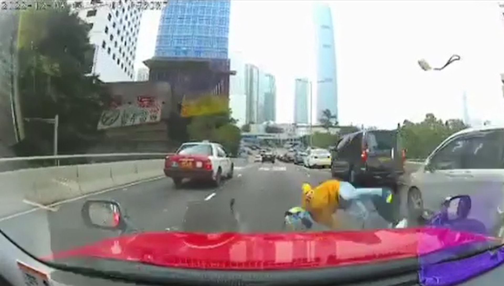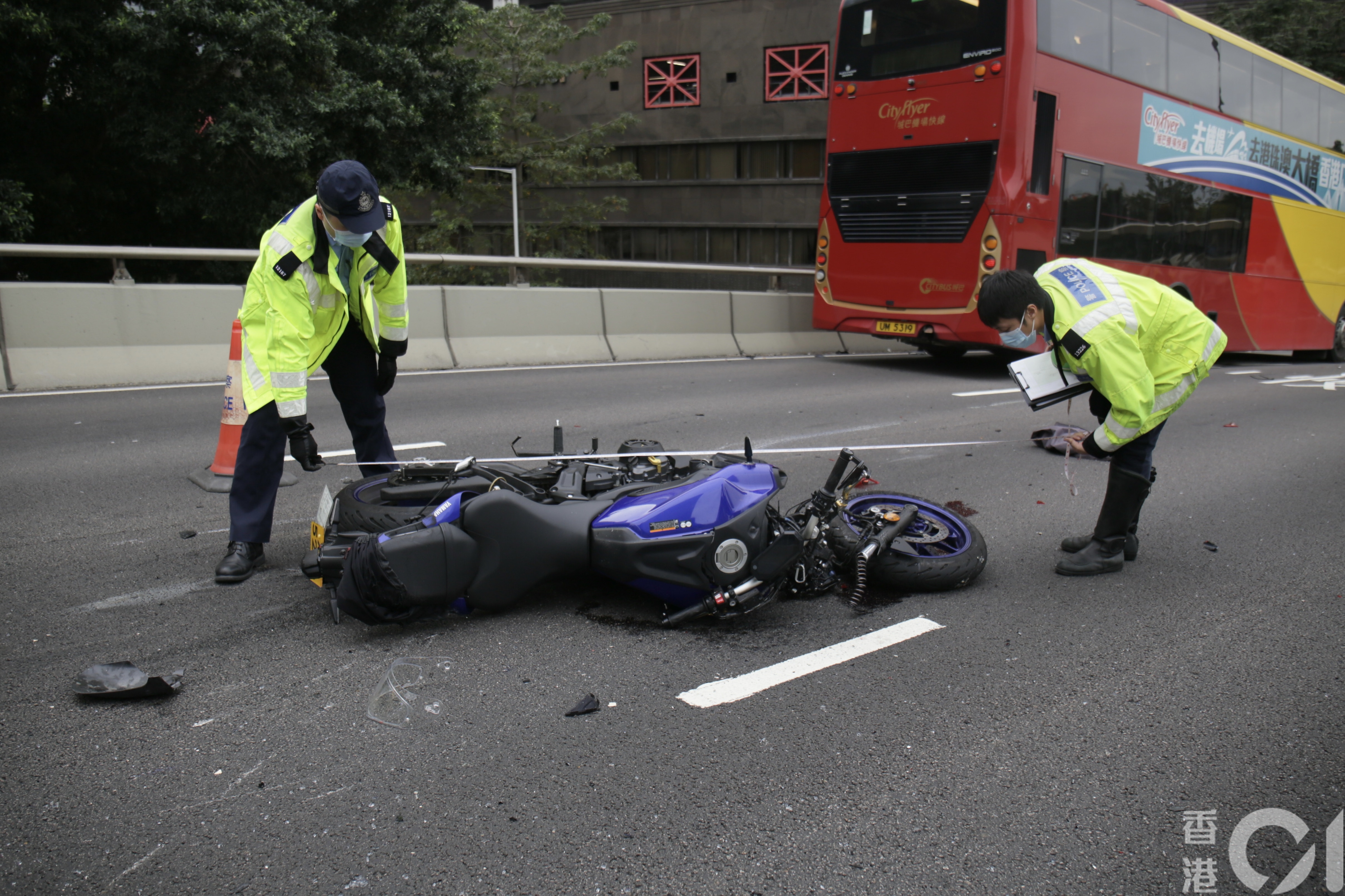一輛電單車沿金鐘夏愨道右1線往中環方向行駛,當駛至夏愨道12號對開,前方一輛私家車因應交通情況收慢,姓周(25歲)鐵騎士收掣不及,直撞向私家車車尾,頓時人仰車翻,整個人跌入右2線。適時,姓余(46歲)的哥駕駛的士尾隨而至,他來不及反應,再撞向倒地的周男,有其他駕駛人士見狀,隨即協助報警。2 Q* o# G4 K' D1 v8 r9 L