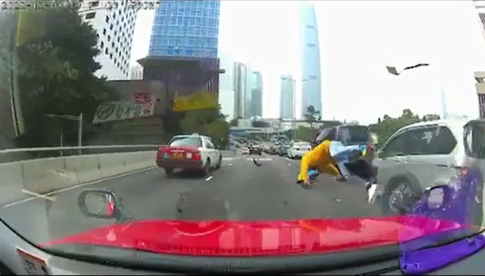 * c, h3 ]" \! u0 V" b鐵騎士撞車後彈飛至中線,的士收掣不及將他捲入車底。(網上影片截圖)TVBNOW 含有熱門話題,最新最快電視,軟體,遊戲,電影,動漫及日常生活及興趣交流等資訊。, I9 ~! Z* X! ], r' ^% Z