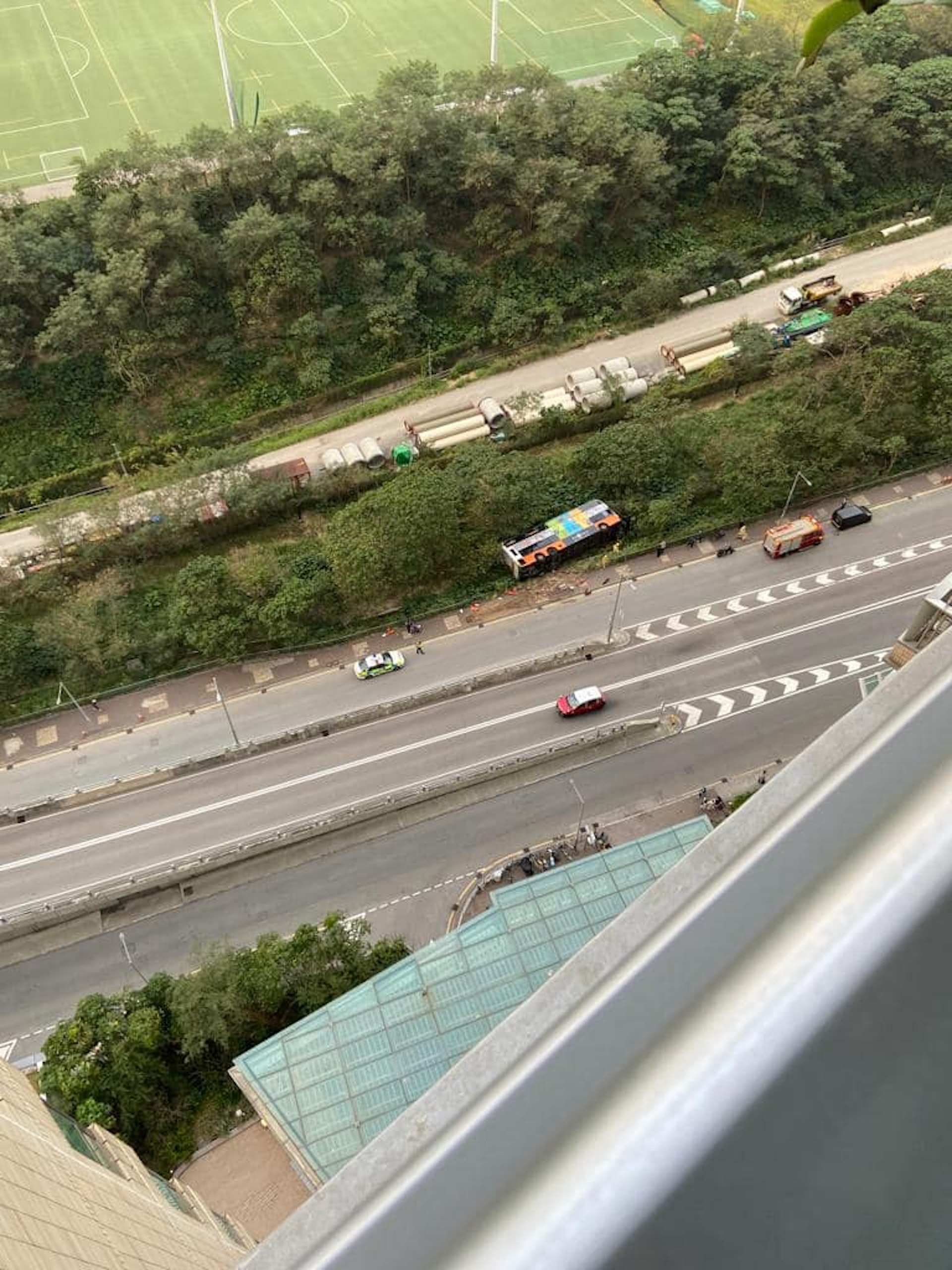 新巴796P雙層巴士在將軍澳日出康城對開翻側。(西貢區議員張美雄facebook專頁圖片); G4 I. } K4 }: {0 u% I