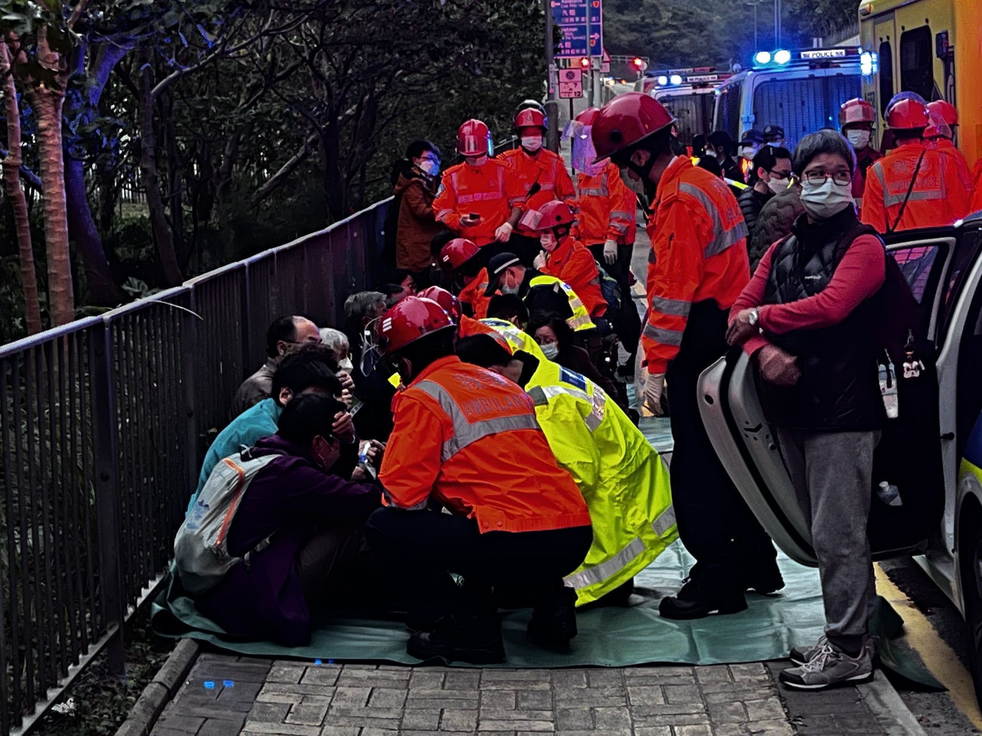 & t0 c7 a# z- v/ e多名傷者被救出後清醒,坐在路邊包紮及等候送院。(朱永倫攝)