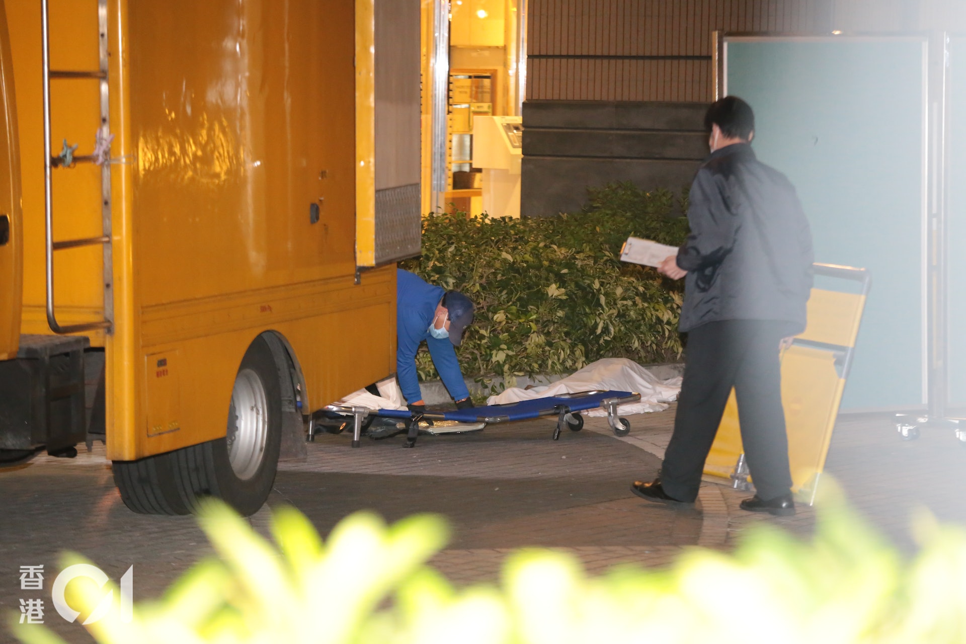 青衣綠悠雅苑2座一名女外傭疑抹窗期間失足墮樓,當場死亡,遺體由仵工運走。(梁偉權攝) |