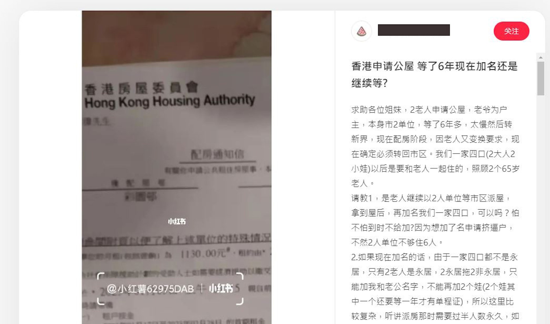 該新移民媽媽於「小紅書」以「香港申請公屋,等了6年現在加名還是繼續等?」為題發文,指她一家四口均為非永久居民,而65歲的老爺奶奶已輪候公屋單位逾6年,原本在新界已到配房階段,但因兩老想轉回市區居住,於是繼續以2人單位申請身份排隊。