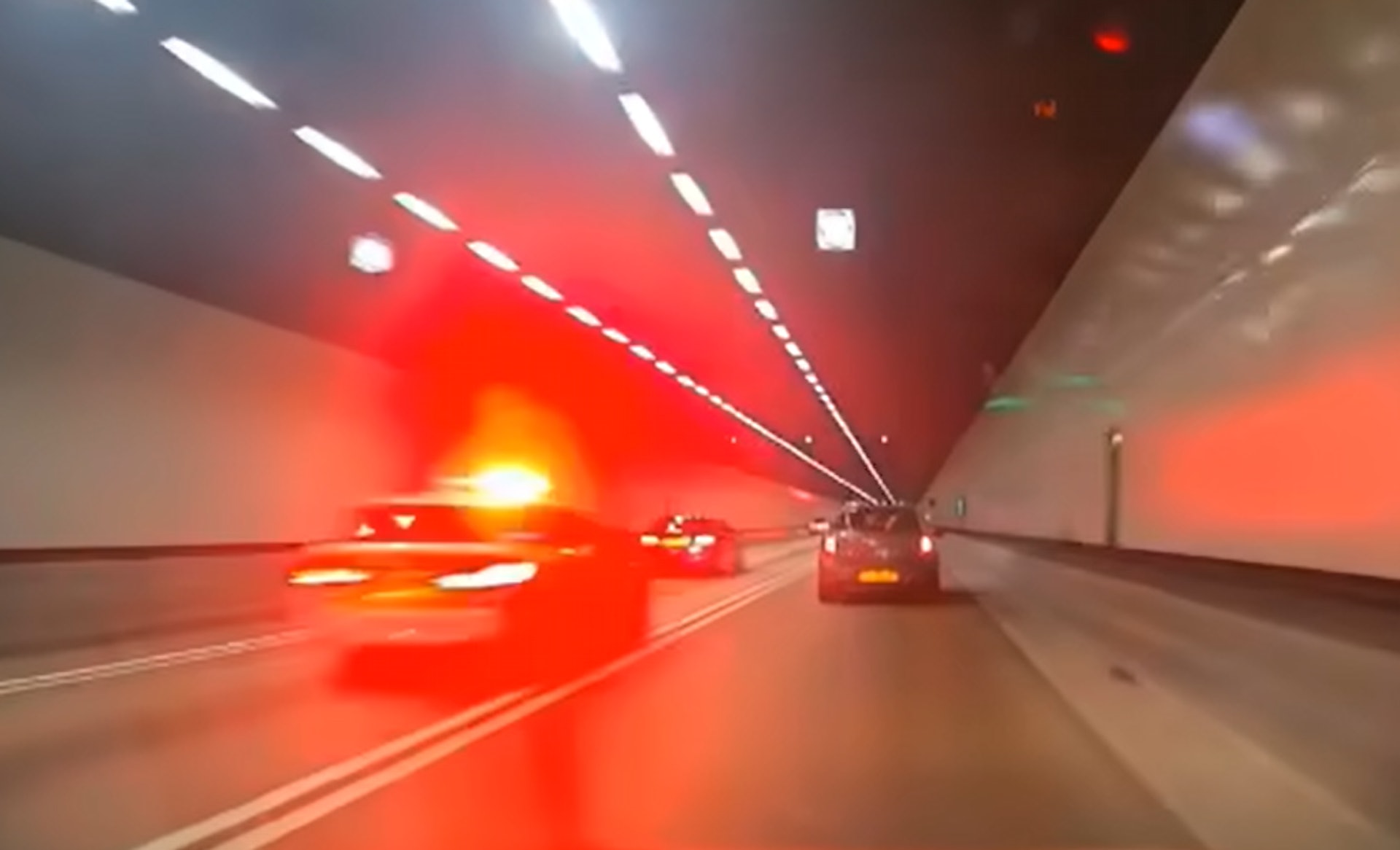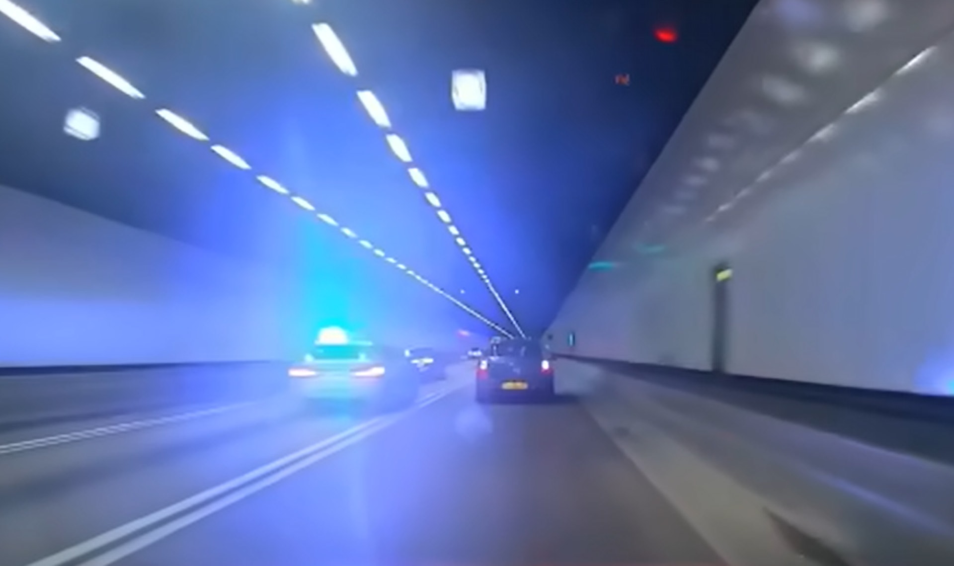 ) B8 w1 x7 Y- S8 htvb now,tvbnow,bttvb網上車cam片顯示,一輛平治疑在大欖隧道中線高速行駛,一輛警車及一輛「隱形戰車」尾隨響號窮追。3輛車駛過時均發出相當震撼的巨響。有網民笑言:「隧道裡面咁似啲F1 賽車聲嘅」、「咁快賀歲盃」;但亦有人質疑,該片段的聲效疑似後期加工。