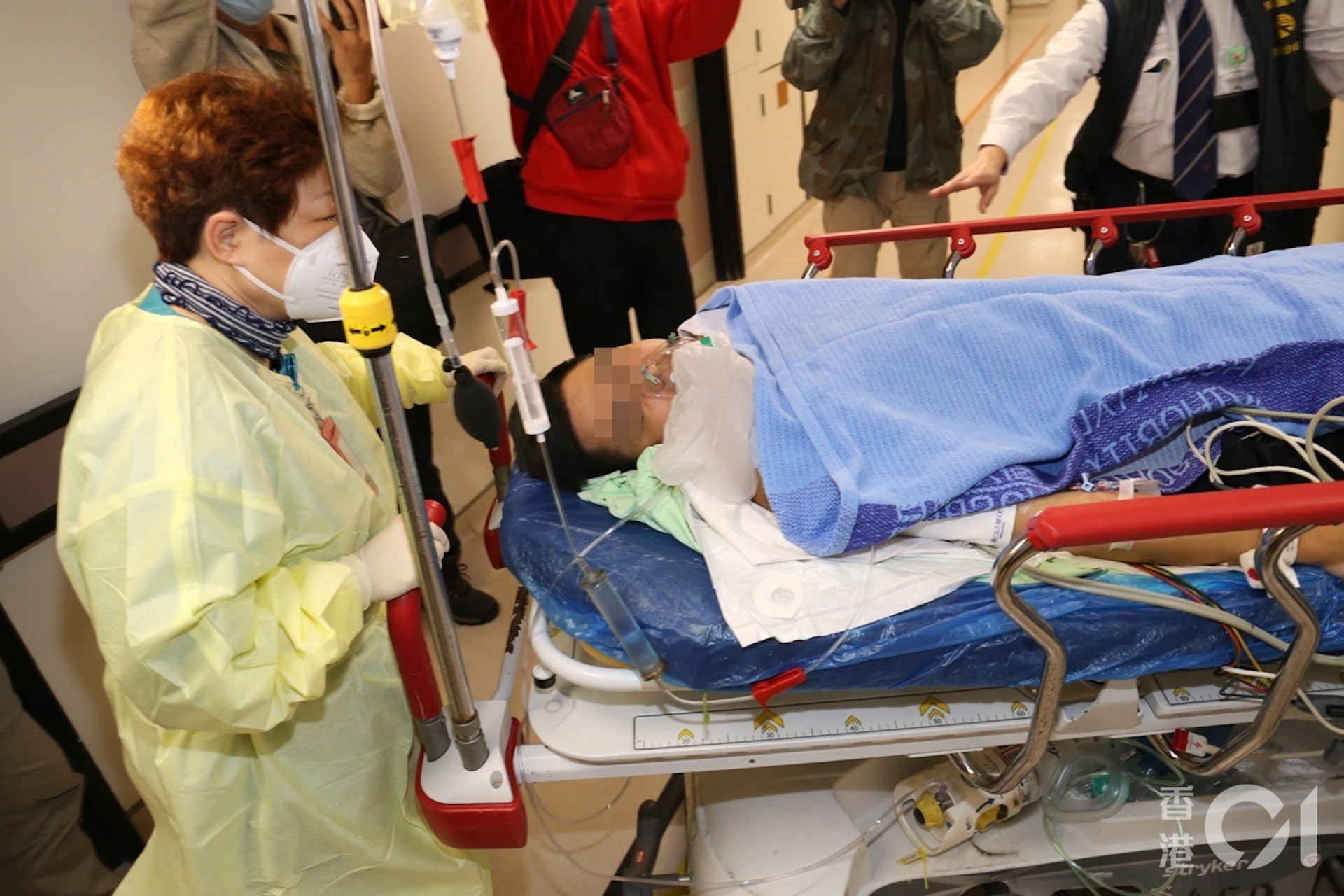 ) P. _& ?& ~7 T5 E8 X. ]開槍警員臥搶架床送往律敦治醫院治理。(黃江奇攝)