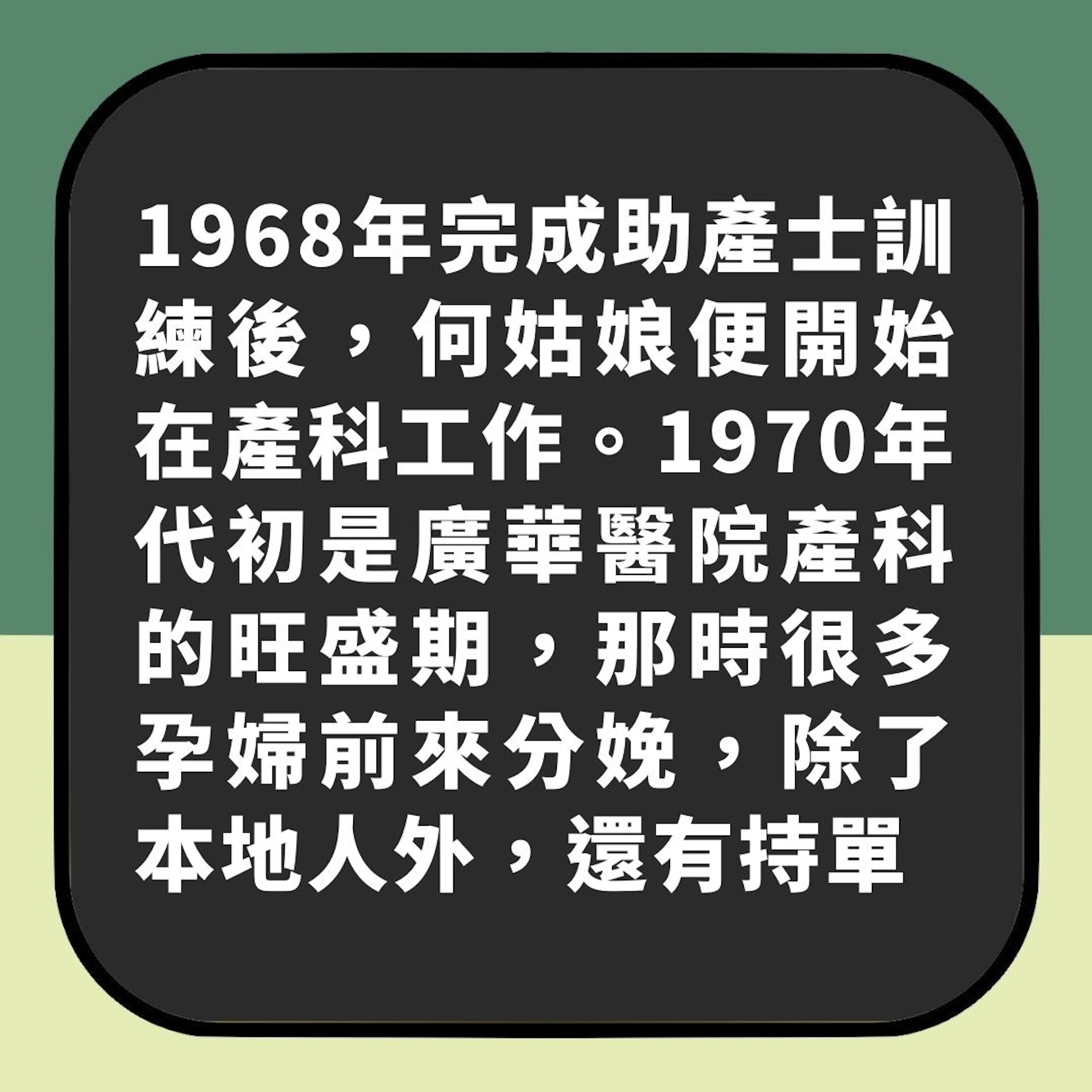 1968年完成助產士訓練後,何姑娘便開始在產科工作。1970年代初是廣華醫院產科的旺盛期,那時很多孕婦前來分娩,除了本地人外,還有持單程證從內地來的,不過也有些是沒有證件的,「警察送來醫院就直接進入產房,什麼檢查也沒有做過,其實也頗危險」。
