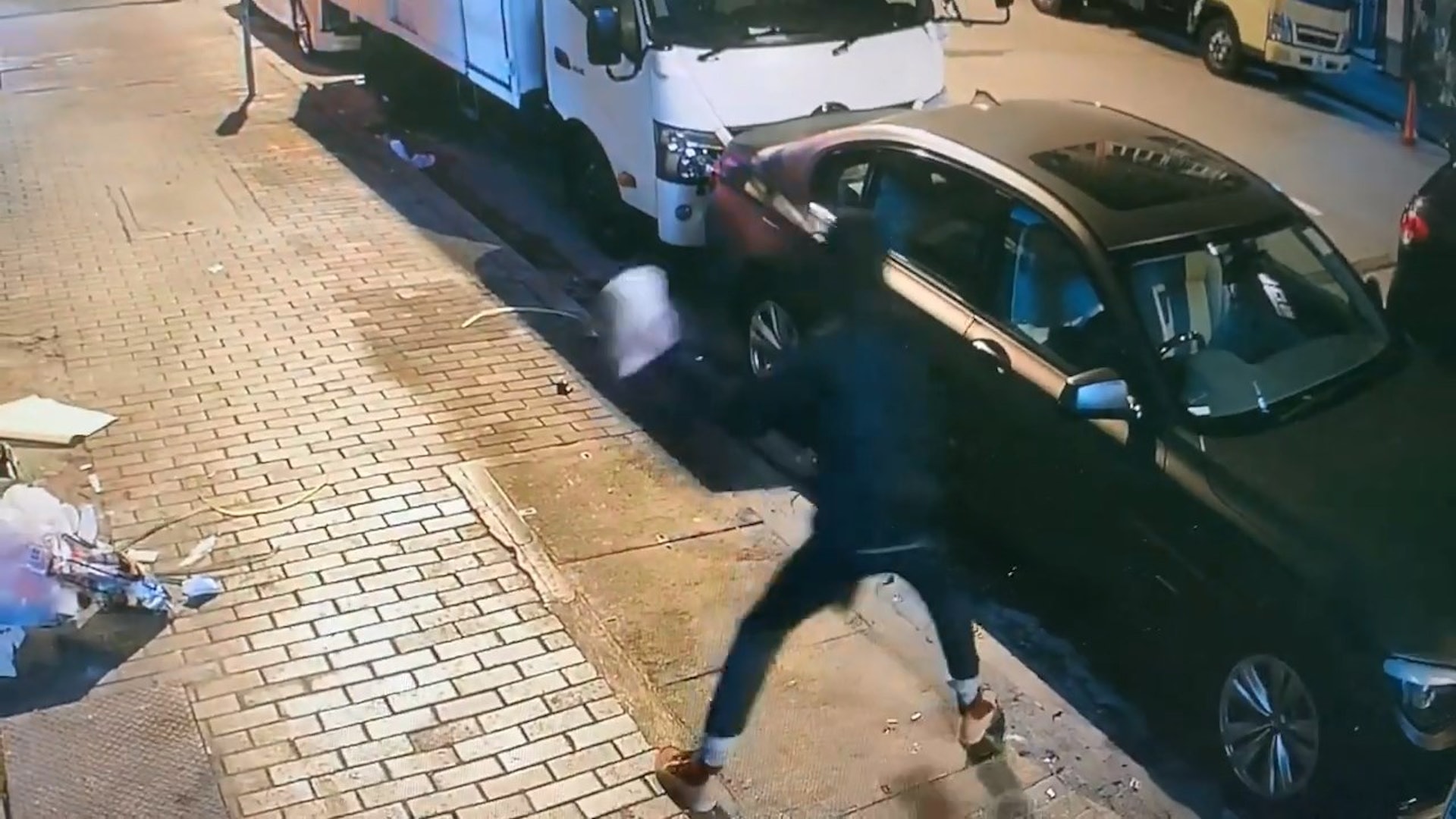 0 {& c0 D5 B% U公仔箱論壇另一片段可見,該名男子同樣持磚猛擲一輛黑色私家車,但嘗試多次仍不成功。(網上影片截圖)tvb now,tvbnow,bttvb3 }; e2 Q9 L/ W' y, o( X' U