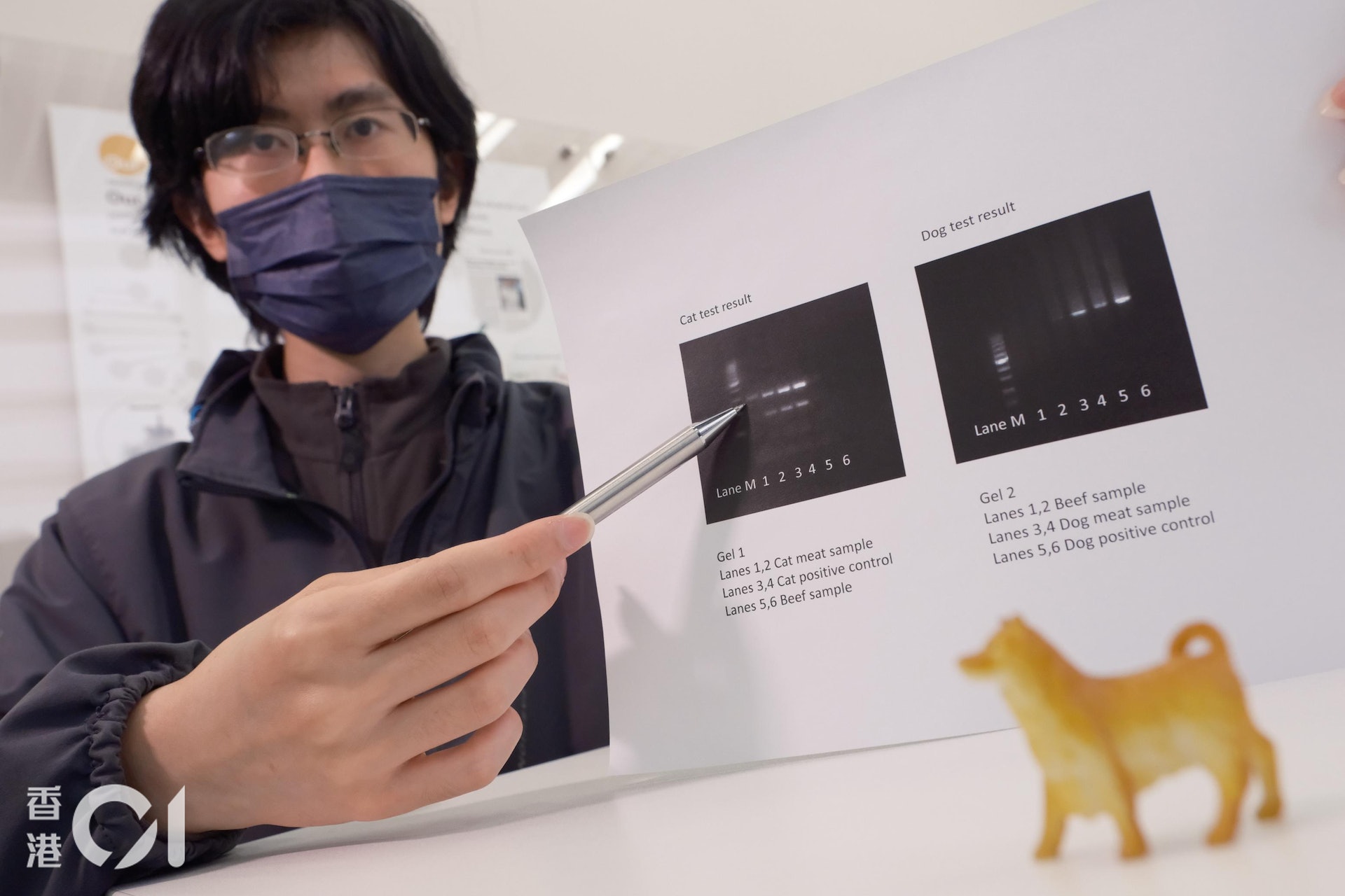 海康生命科技實驗室技術員彭頌謙解釋,每個物種的基因排序都不同,提取出來的基因碎片重量亦各異,在實驗中會以不同速度在凝膠上游走。他指,從記者買來的樣本中提取的基因,在實驗中分別與含貓及狗基因的陽性對照,顯示相同的光譜排列,證實樣本為貓狗肉。