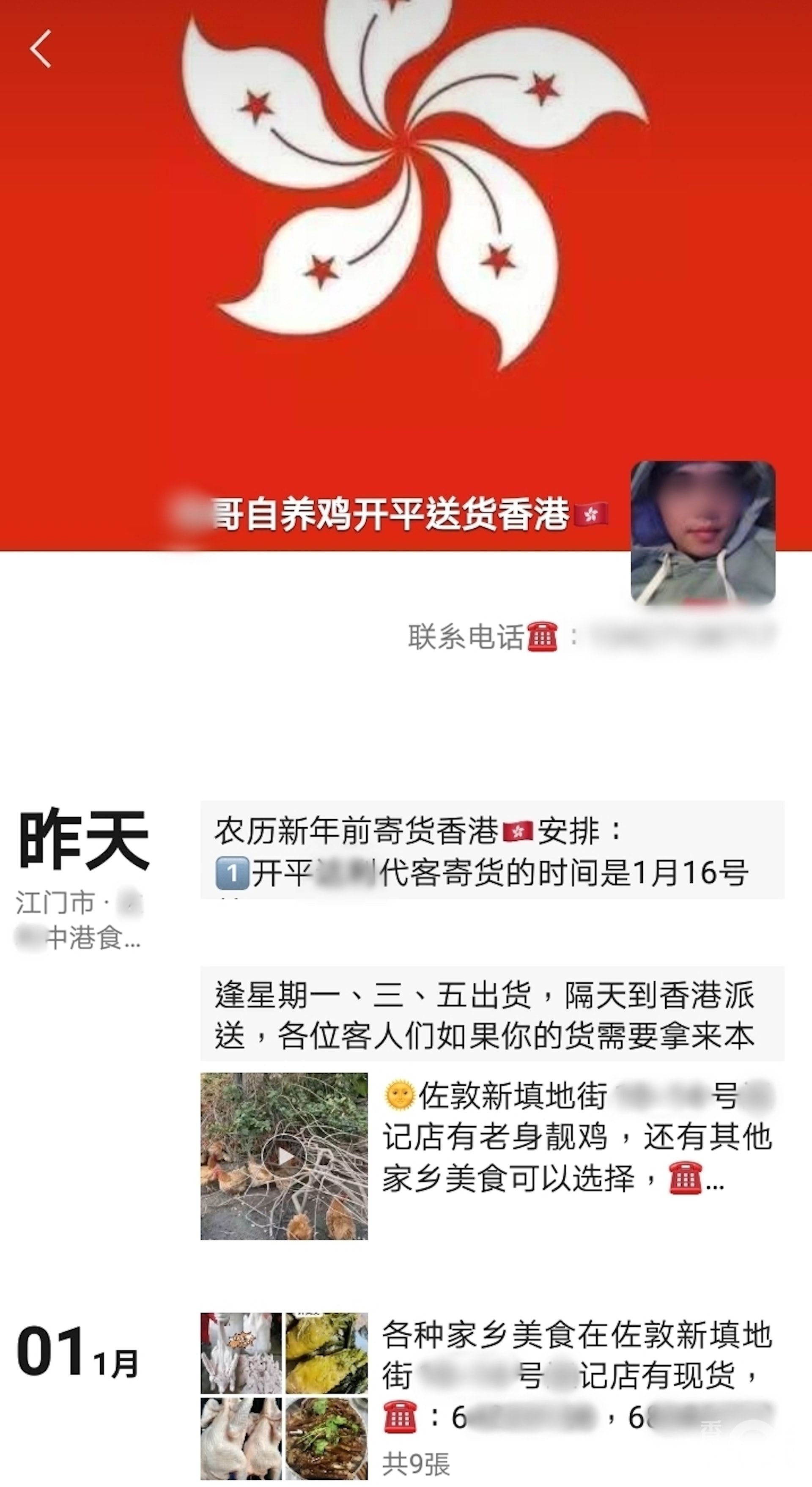 微信上有內地帳戶聲稱,可以將家鄉土產由開平直送香港。