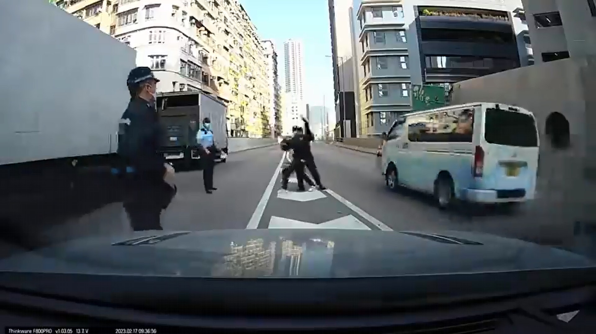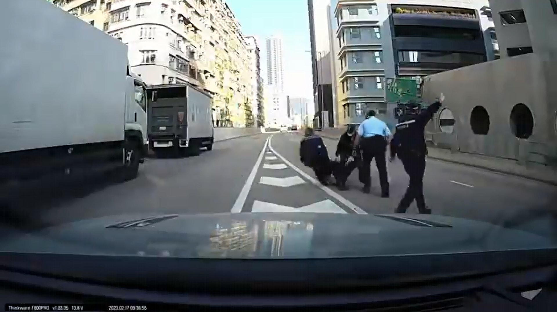 社交平台流傳一段車Cam片段,拍攝到一名男子在西九龍走廊橋面走出路面,甚為驚險,要多名警員拉扯制服。