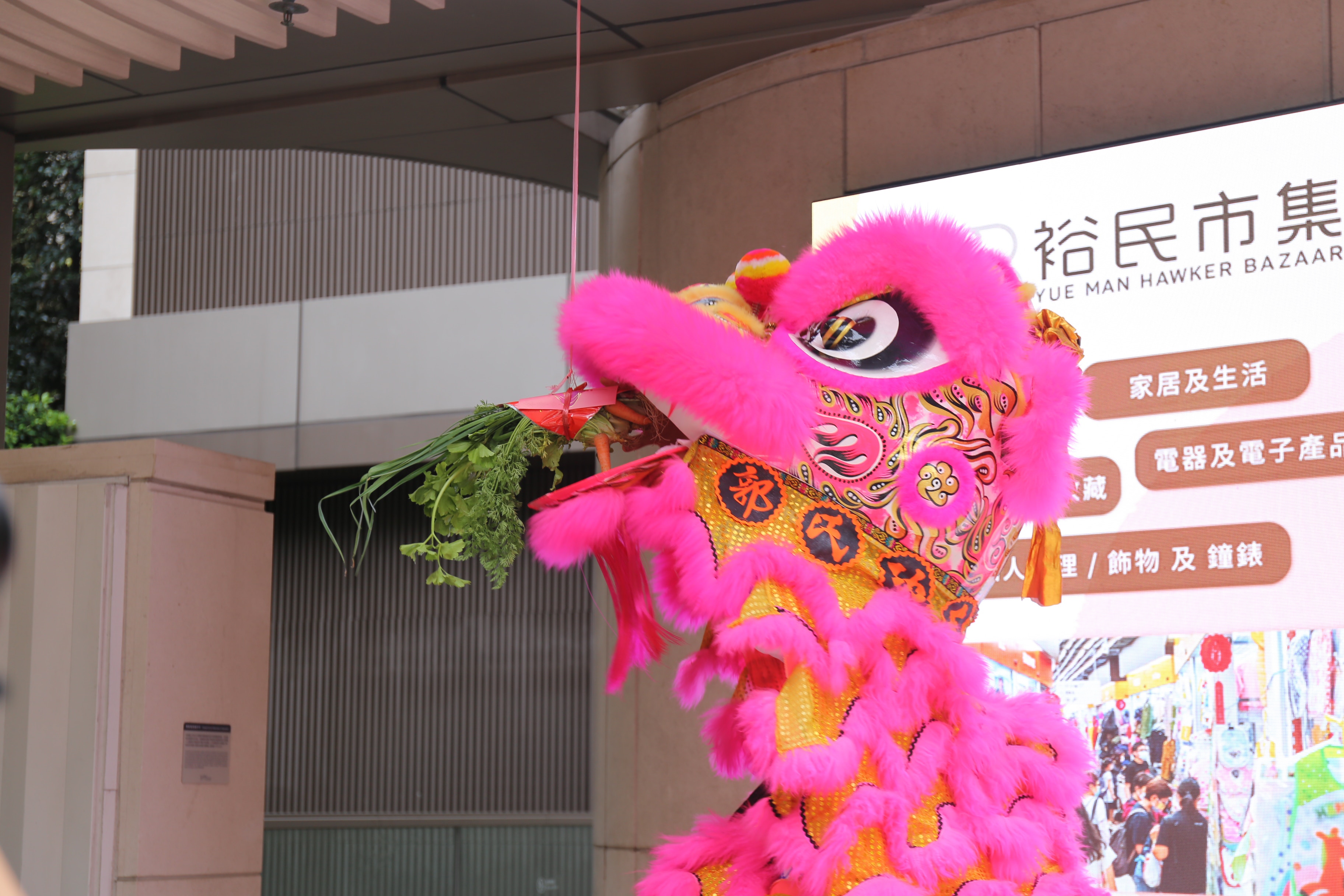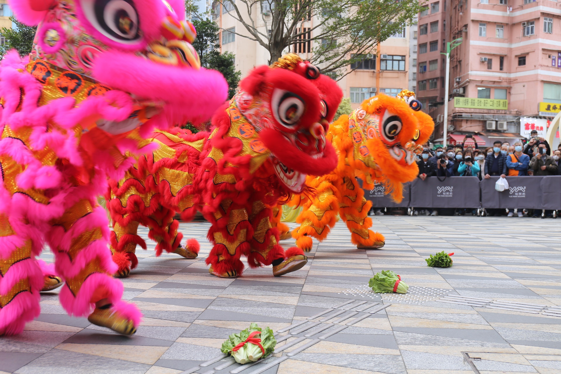 ! `. o$ o2 s, o' H三頭醒獅元宵當日於觀塘裕民坊商場演出及巡遊,團員將生菜放於地上,讓醒獅「咬青」,象徵五穀豐收。(鄭嘉惠攝)