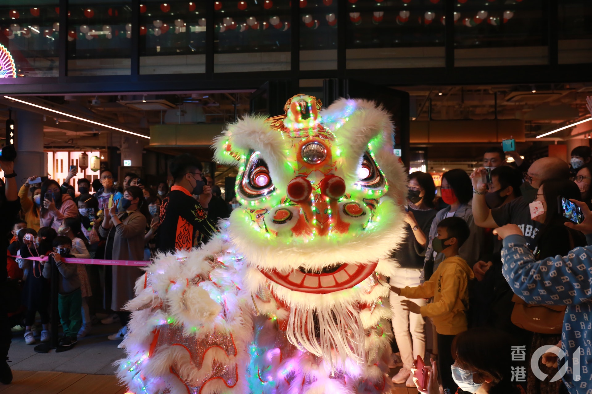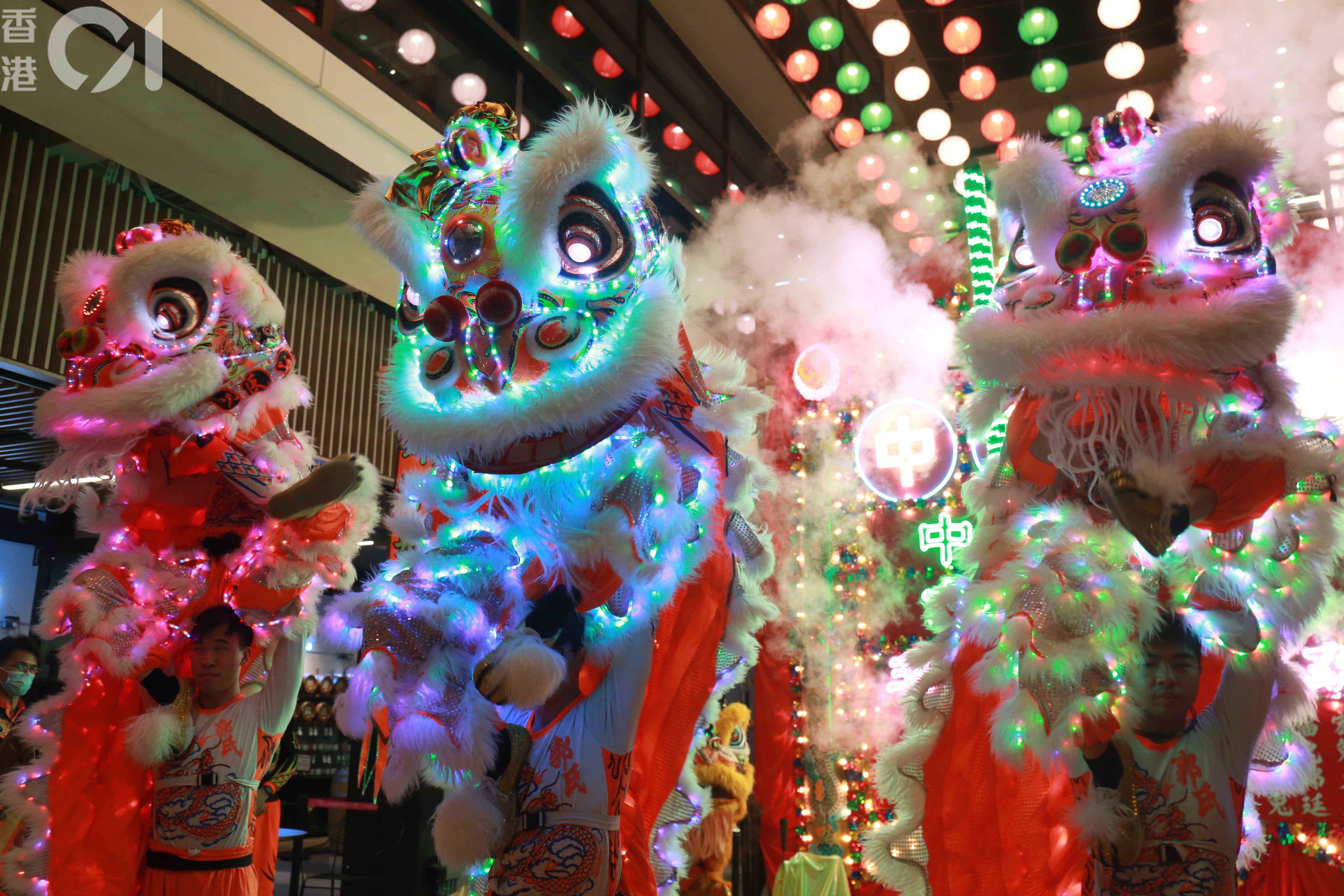 郭氏的舞獅隊於中環街市表演。創新獅子的顏色造型,看起來色彩繽紛、毛絨絨,惹人喜愛,更糅合多媒體等元素進行表演,例如「LED獅」,洗脫傳統文化昔日的刻板印象,煥然一新。(林振華攝)
