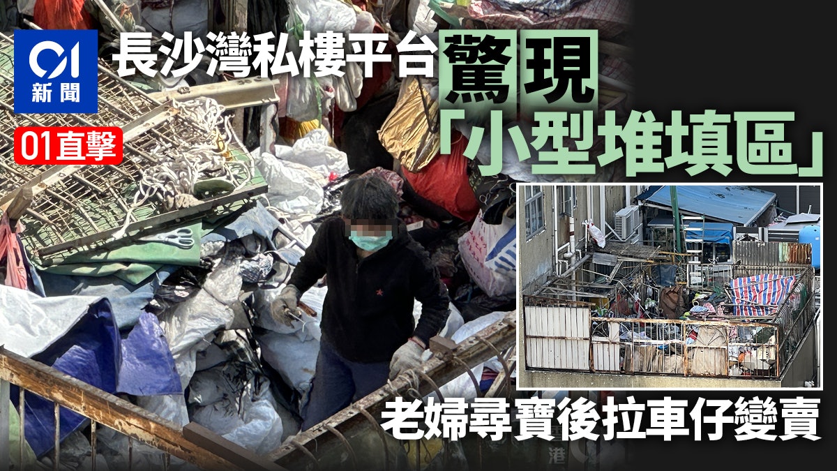長沙灣一棟私人大廈低層平台近日驚現「小型堆填區」,約百呎平台堆滿約一個成人高度的垃圾、帆布袋及爛銅爛鐵,雜物堆之間留有狹窄通道,可見一名戴勞工手套及口罩的老婦人遊走其中,時而坐下整理物品。鄰廈住戶目擊情況大為震驚,拍下照片分享至社交平台,引起網民熱議,有人認為「肯定勁多老鼠曱甴,有個呢啲鄰居真係勁慘」、「呢種人有囤積雜物病態」。《香港01》直擊老婦於單位執拾鐵枝後,運至附近回收貨車變賣,記者嘗試追問囤物原因但不獲回應。當區區議員接獲街坊求助,向食環署反映事件,據悉署方人員已接觸婦人,正商量清理雜物的時間。