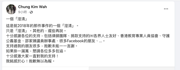 鍾劍華在社交平台上載的澄清啟事(鍾劍華FB圖片) |