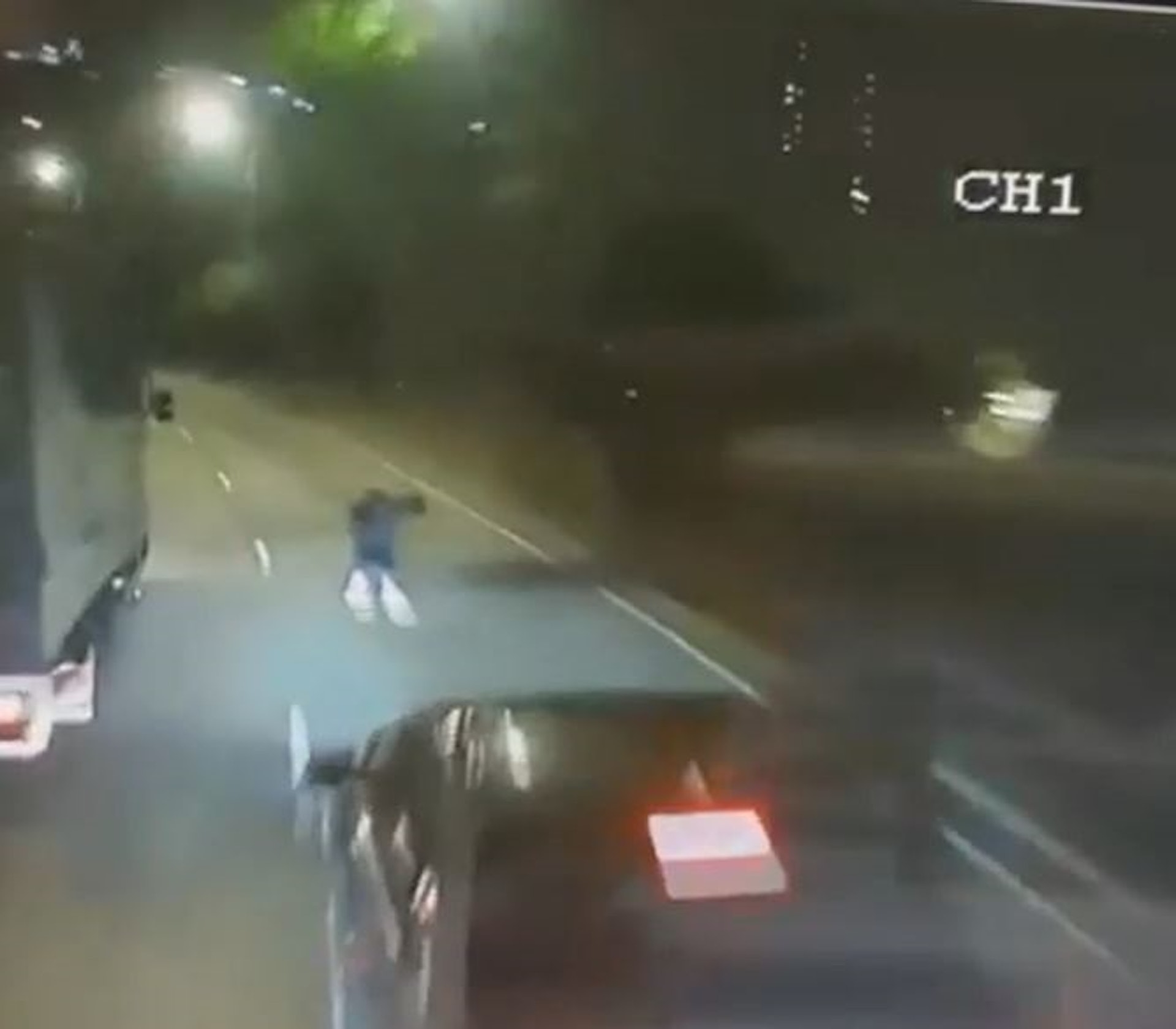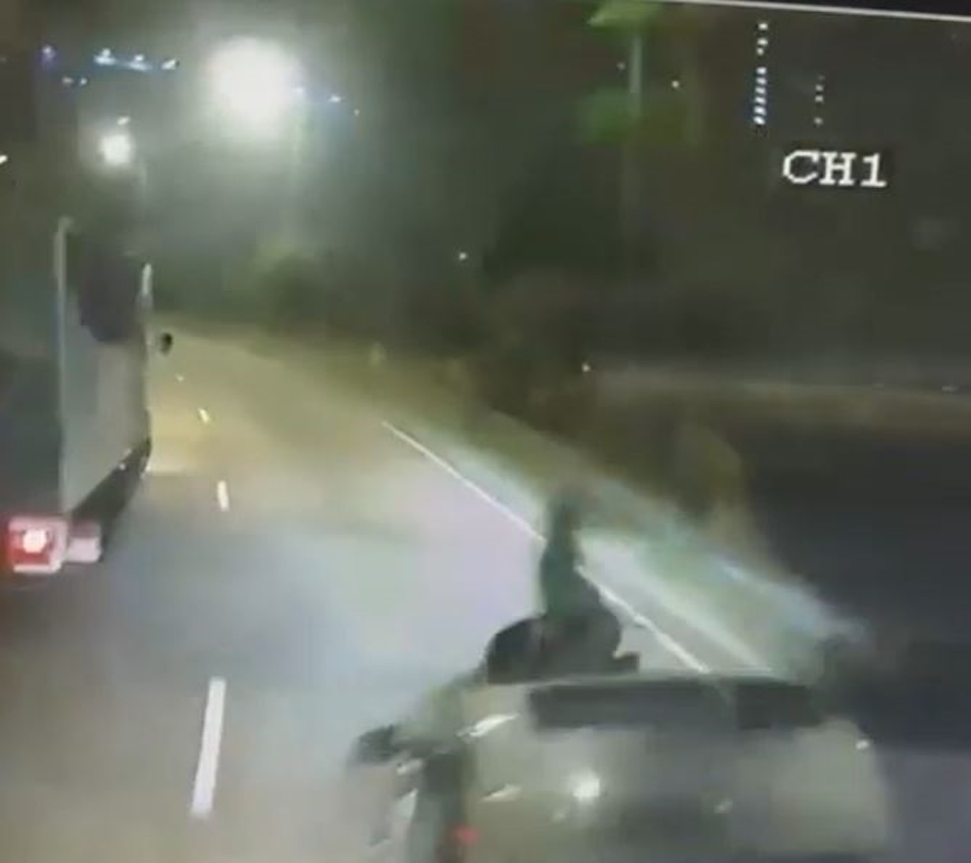 社交網站今日流傳一條恐怖車禍的「車cam片」,事發晚上的公路慢線有一輛貨車前行,快線則有白色私家車高速行駛,其時有人由左至右走出馬路,貨車見狀立即減慢車速,私家車亦盡量收慢,但懷疑後方另一輛車原先是沿慢線行駛,見到貨車減速下便轉入快線,當白色私家車盡力減速時,車尾卻被撞及,結果衝前撞及過路人。