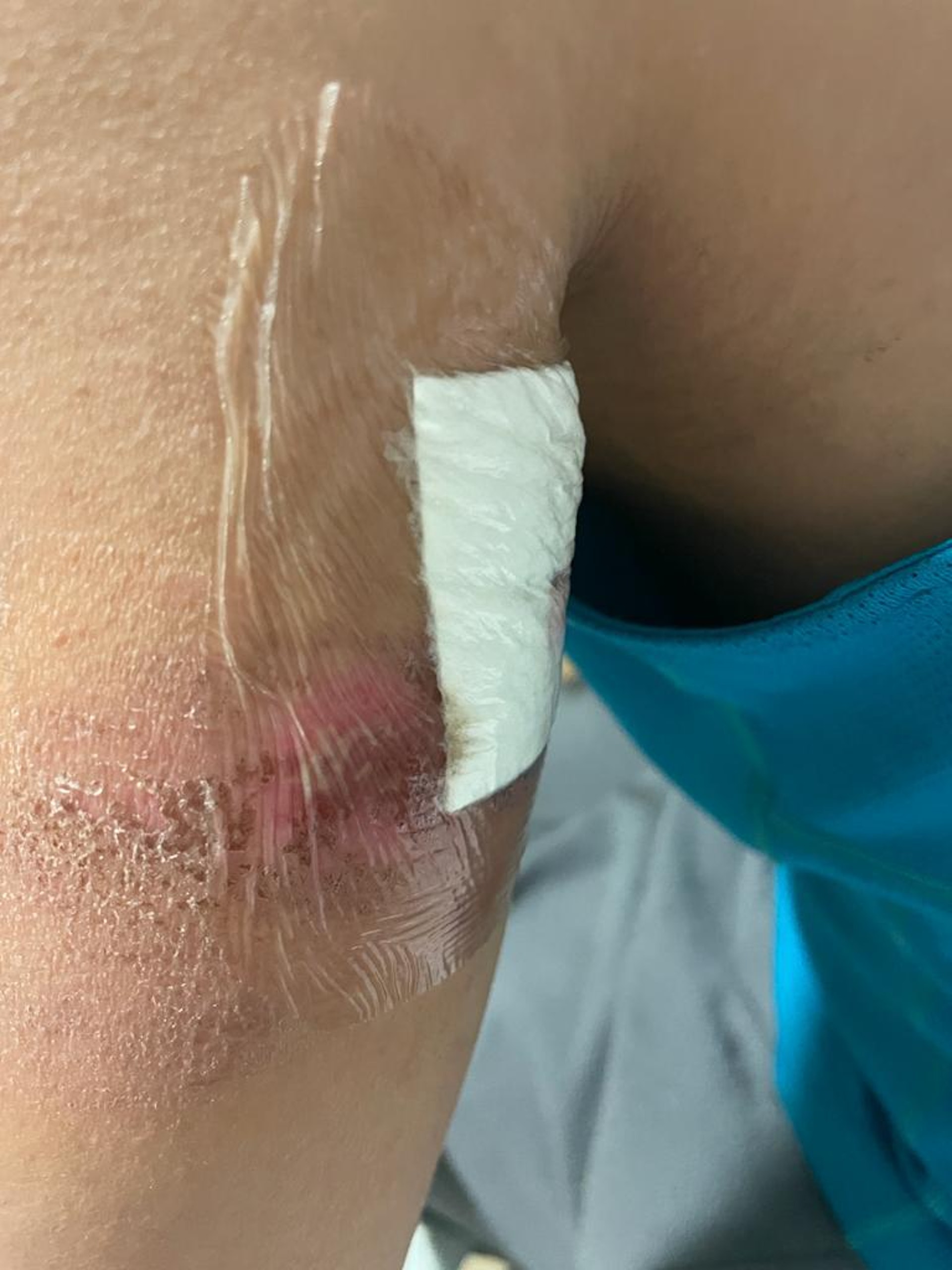 / B$ ?/ N* Y$ C& {由於Mike跌進湖泊時是腋下先落水,故腋下沒了一層皮,滲出血水。(受訪者提供)0 b7 M; q3 `$ I! m! D: t$ W0 m