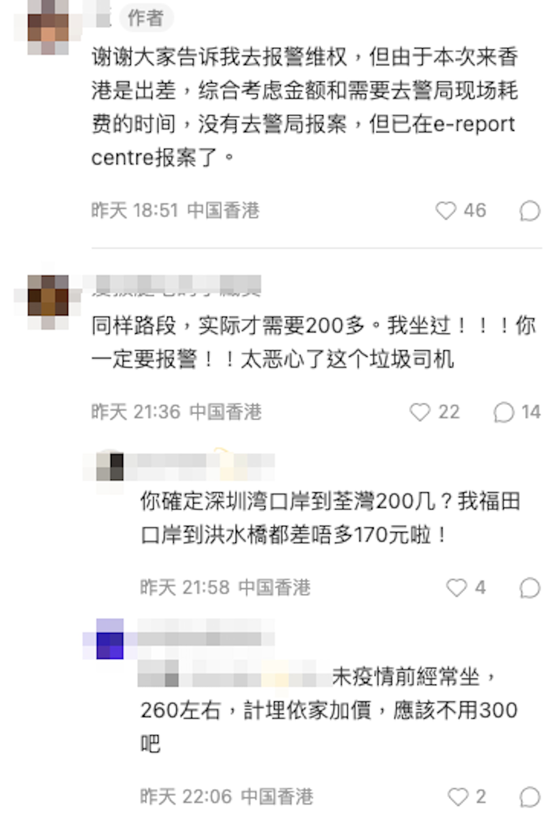 在樓主分享了被的士劏客的經驗後,不少內地網民也紛紛提到自己類似的經歷,表示「昨天黃埔到土瓜灣,被的士收$242,估計沒人比的更牛的」、「我月中去然後被司機$500換$100,我還以為眼花給錯,最後總共給了$600」。有網民稱最近也乘坐過同樣的路線,表示金額大概$200多,也有網民以手機程式HK Taxi估計收費,車資大約為$230-260,樓主的$517車資明顯存在詐欺成份。